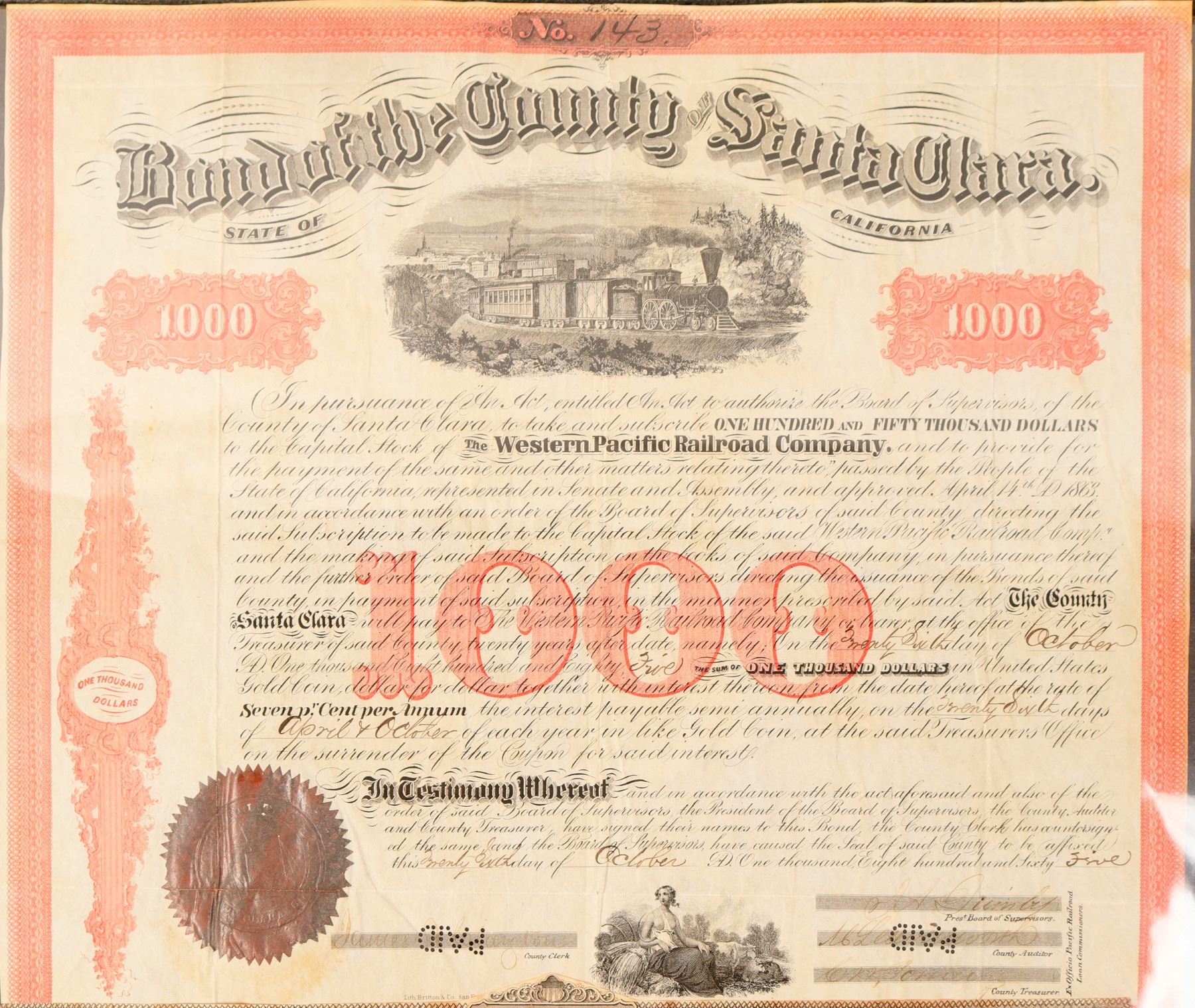 Santa Clara County in aid of The Western Pacific Railroad Co, I/C, #143 $1000 7 %, 20 year bearer bond due 1885, issued Feb 25, 1865 signed A. A. Fuinby Pres. County Board of Supervisors. punch "paid" canceled . RED, embossed seal, vignette top 4-4-0 leaving city. Vignette bottom agriculture allegorical female. "1000" red underprint, Britton & Co printers. . No tears, holes but does have some discoloration. Ken Prag Collection