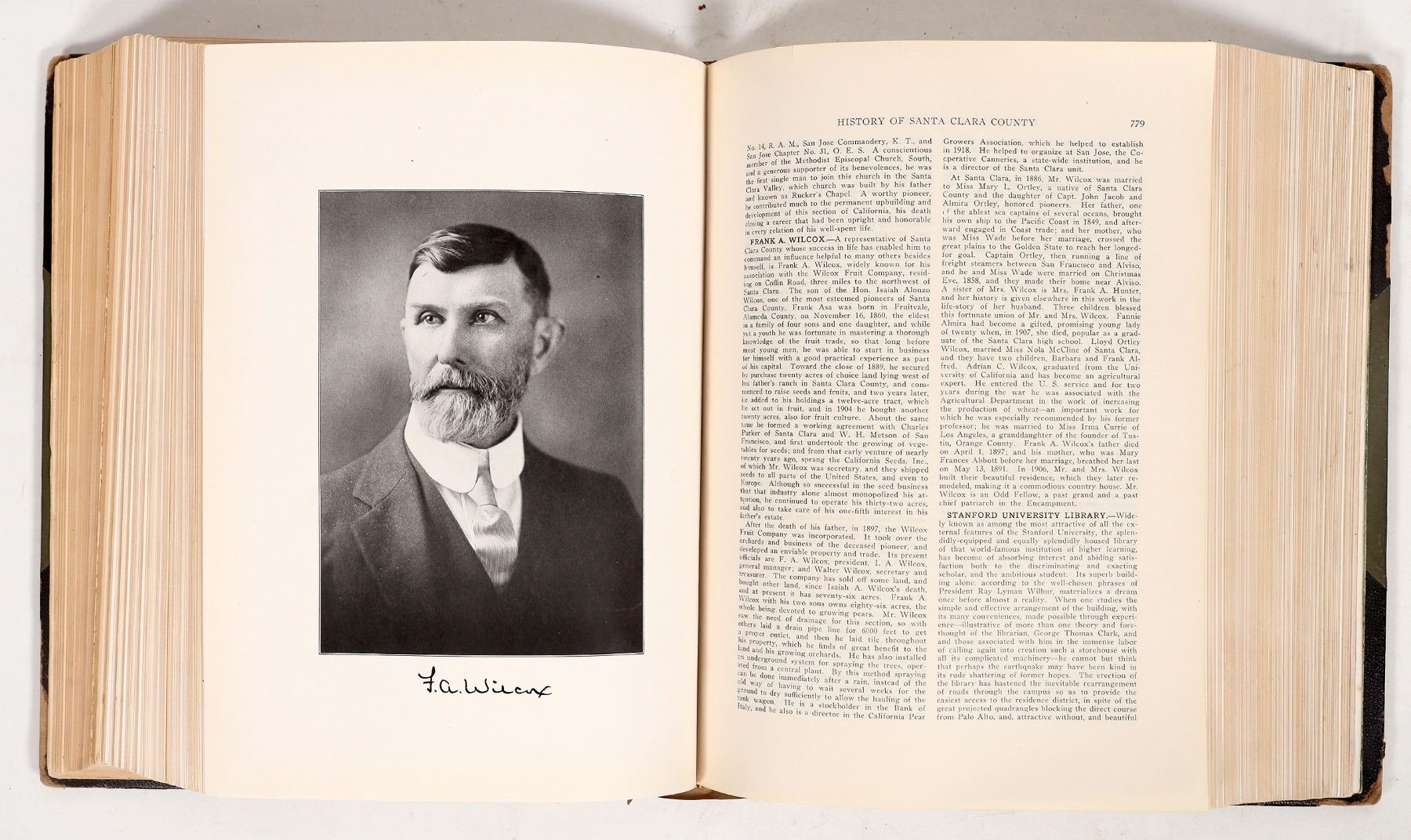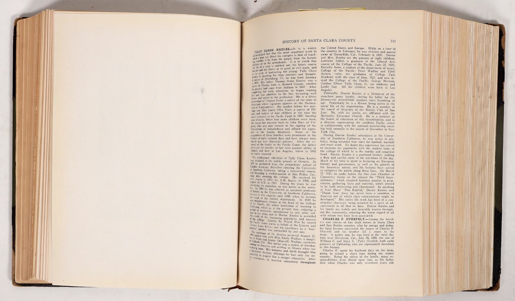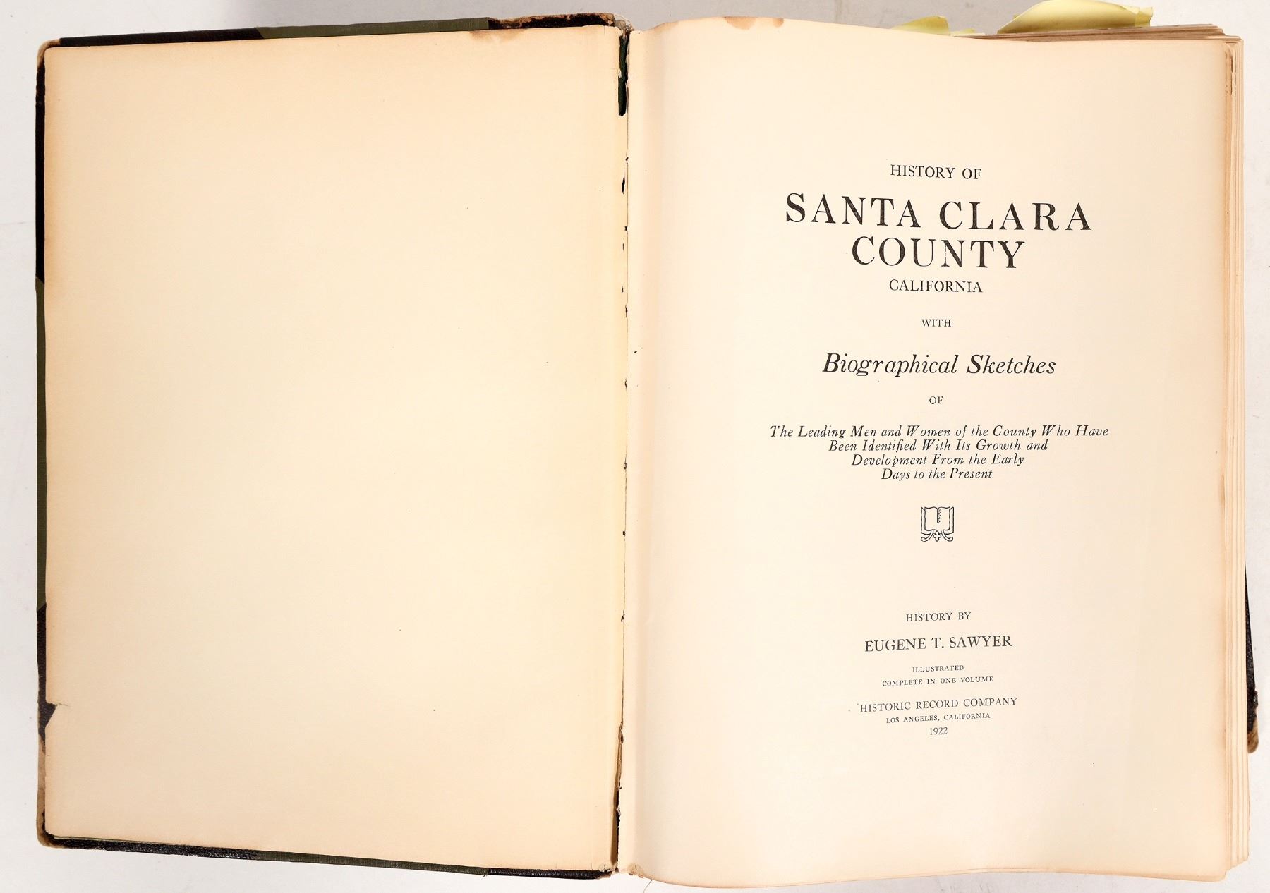 A copy of 'History of Santa Clara County, California, with Biographical Sketches of the Leading Men and Women of the County who have been Identified with its Growth and Development from the Early Days to the Present' by historian Eugene T. Sawyer, published in 1922 by the Historic Record Co. of Los Angeles. The book is illustrated with photographic portraits of notable Santa Clara residents. Hardback, 1692 pages. The book has some wear to the cover, and the spine has been replaced entirely. See photos. An excellent reference piece for any California historian.
