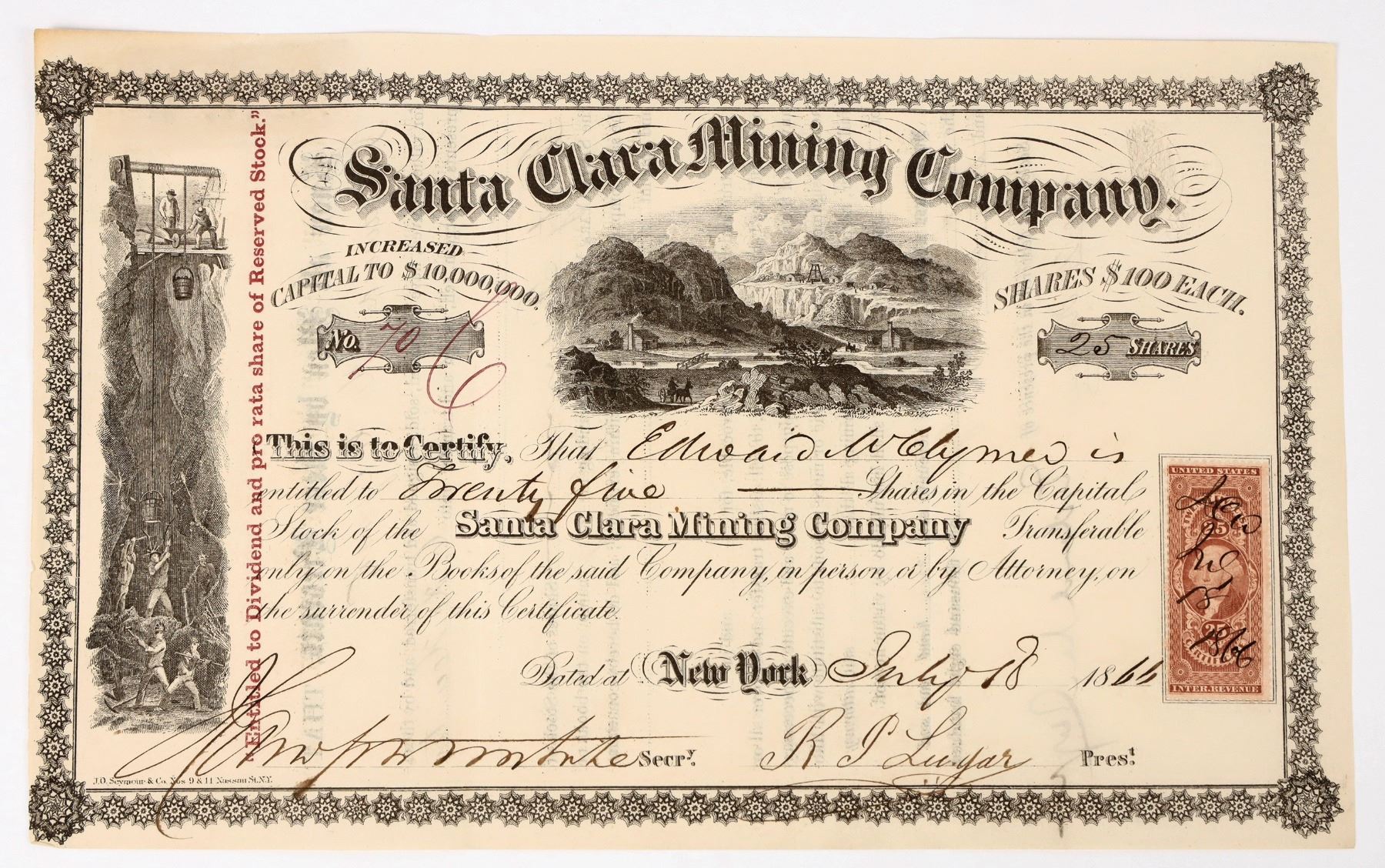 We have previously sold this as New Almaden (California). Possibly Mexico. No definitive proof on newspapers.com. No. 70, issued for 25 shares in New York in 1866. Signed by president RP Lugar and the secretary. Not cancelled. Two nice mining vignettes. Clean condition. The location is difficult to determine. We did find one history (local school history online) that talked about a Santa Clara Mine. "Back in the early mission days, Father Junipero Serra and the other Padres at the Mission Santa Clara, visited the three tribes of Indians that lived in the area. Gradually the area and the creek became known as Guadalupe by the Padres. There is also a quicksilver mine near the creek, called Guadalupe Mines. In 1846 it was mined by the Indians until 1856. From 1856-1875, it was mined by the Santa Clara Mining Company. Then for the next ten years, the Guadalupe Mining Company mined it. This is the only reference to a Santa Clara Mine in 1865 that we found.