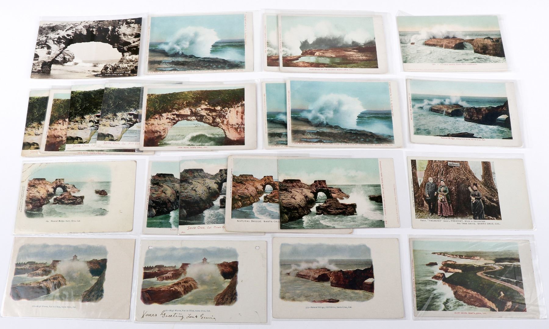 lot of 23. One RPC, divided of Arch Rock b/w. Three are embossed. One is a view of General Fremont and family in front of the Fremont Redwood. Remainder are scenes along Cliff Dr. In protective sleeves. None are postmarked. Santa Cruz California Ken Prag Collection