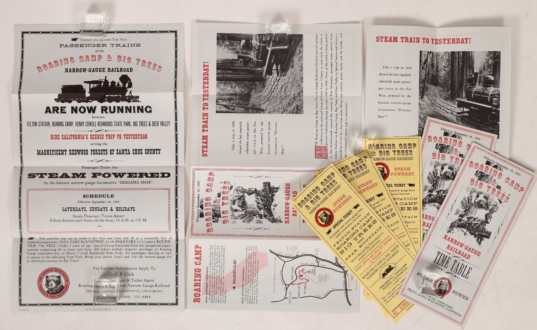 5x 1965 Roaring Camp & Big Trees Narrow Gauge Railroad time tables and 3x tickets. Santa Cruz California