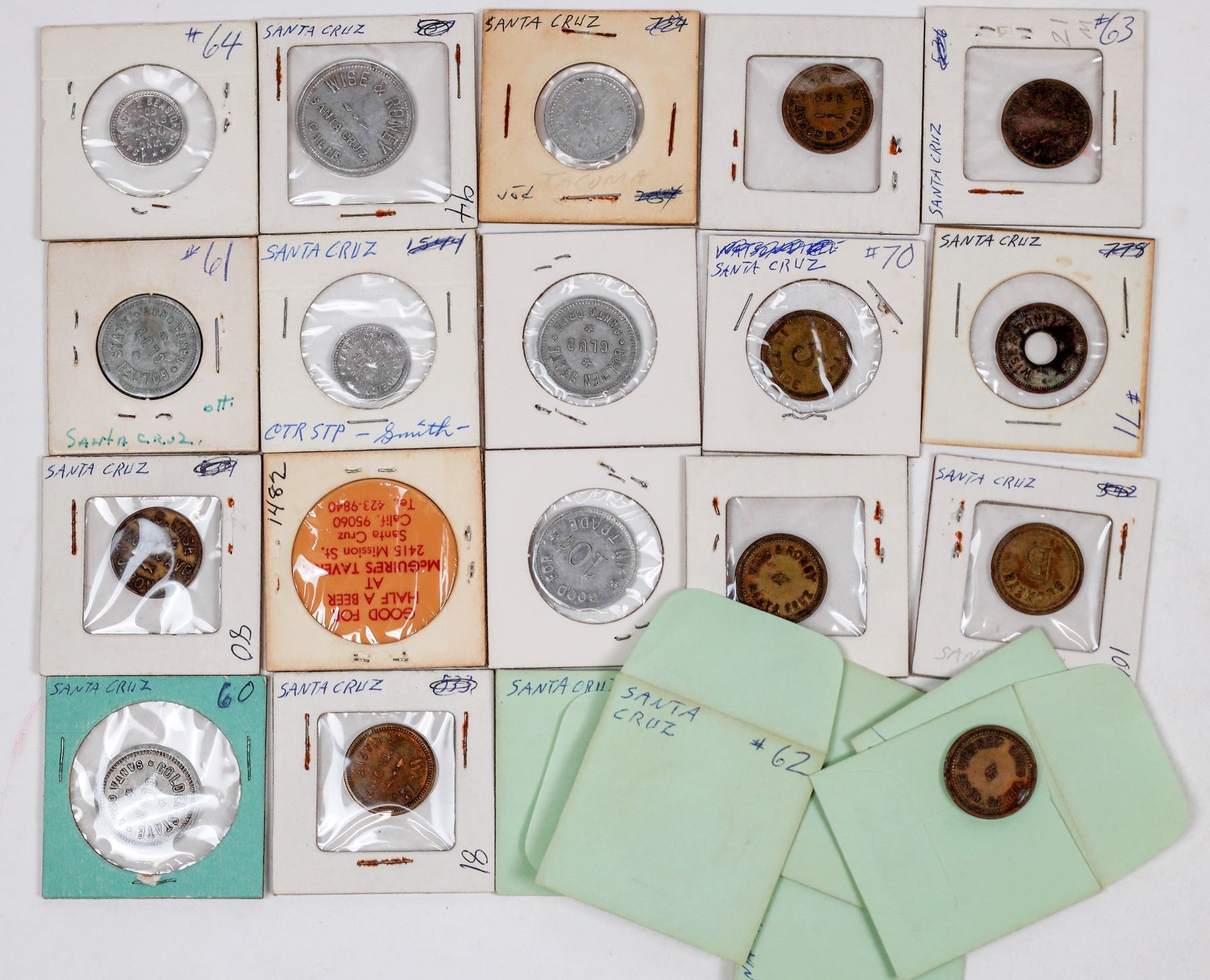 Lot of 25 tokens from Santa Cruz: Wise & Roney (12) (several different varieties) ; The Spar; McGuire's Tavern; Santa Cruz Seaside Co. (2); Golden State Club (7); Buckeye; "W. R.".