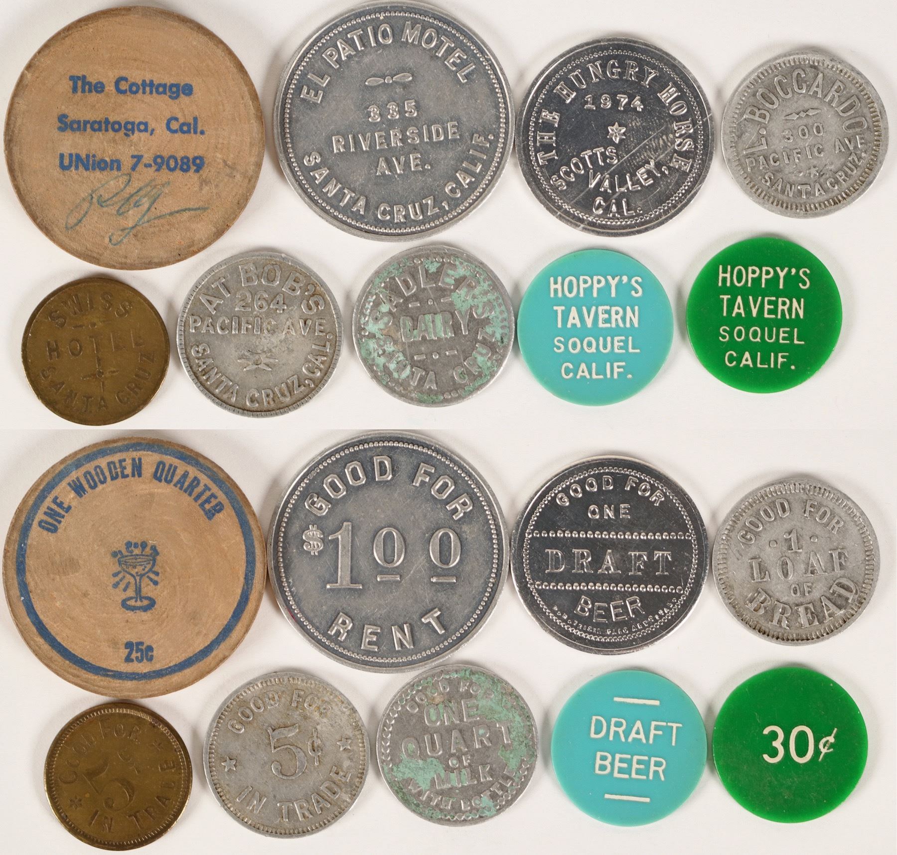 Includes: The Hungry Horse/Scott's Valley/Cal/GF/one draft beer/A (1974 unlisted); L.Boccardo/Santa Cruz/GF/Loaf of bread; At Bob's/264/Pacific Ave./Santa Cruz, Cal/GF/5c/IT. Unlisted. Swiss Hotel/Santa Cruz//GF/5c/IT. Hoppy's Tavern/Soquel, Calif (2)/GF 30c, GF Draft Beer/Grn Plastic, Blue Plastic. El Patio Motel/335/Riverside/Ave/Santa Cruz, Calif.//GF $1.00/Rent/A.rd.; The Cottage/Saratoga, Cal./Union 7-9089//One Wooden Quarter; Sadler's Dairy/Santa Cruz//GF/One/Quart/of/Milk/with bottle/A 23 1/2 bb