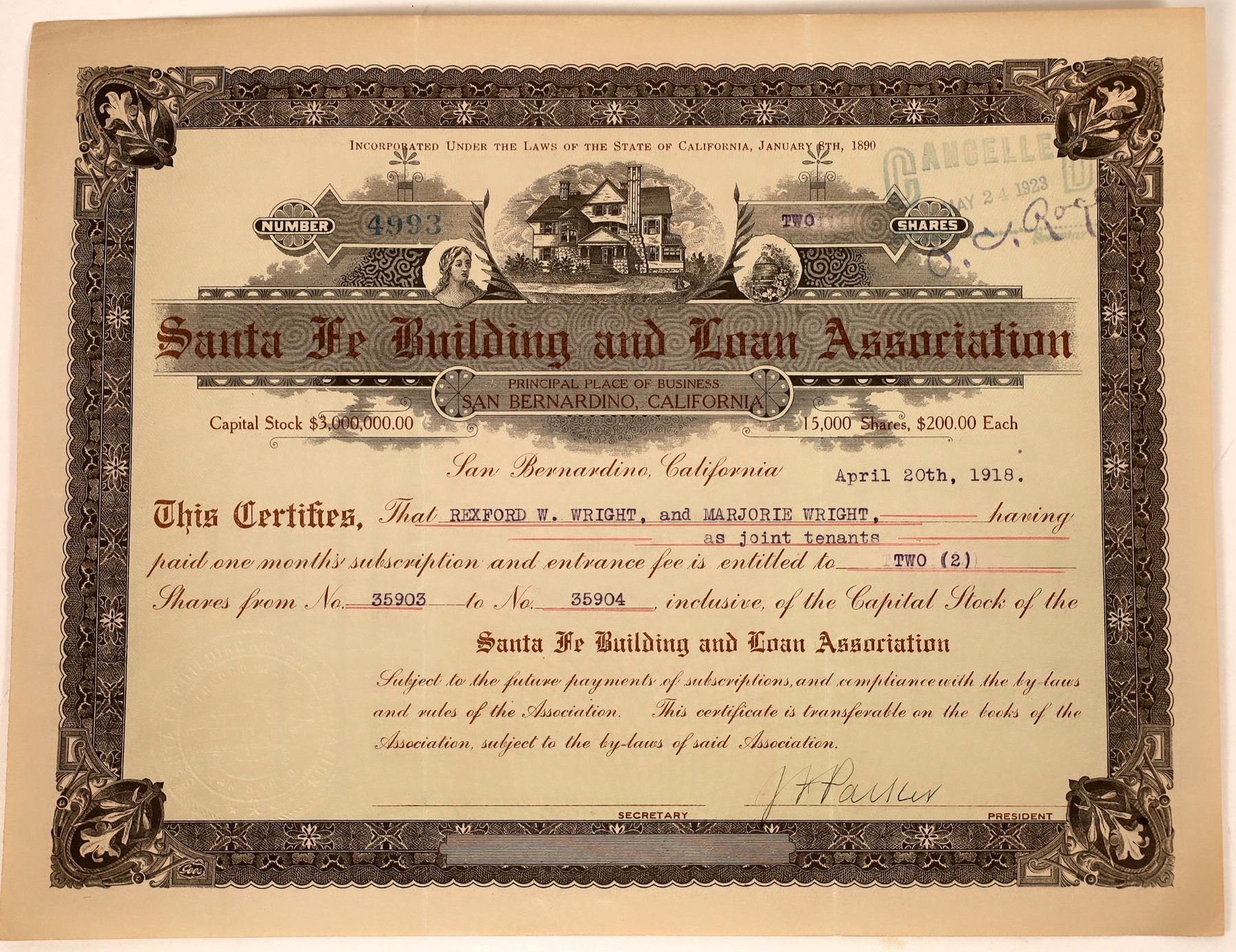 Principal Place of Business: San Bernardino, California. Inc. in 1890. No. 4993, issued for 2 shares to Rexford W. Wright and Marjorie Wright in 1918. Signed by president Parker. Stamp cancelled. Black border, brown print, and vignette of house. Folds. 8.5 x 10.75"