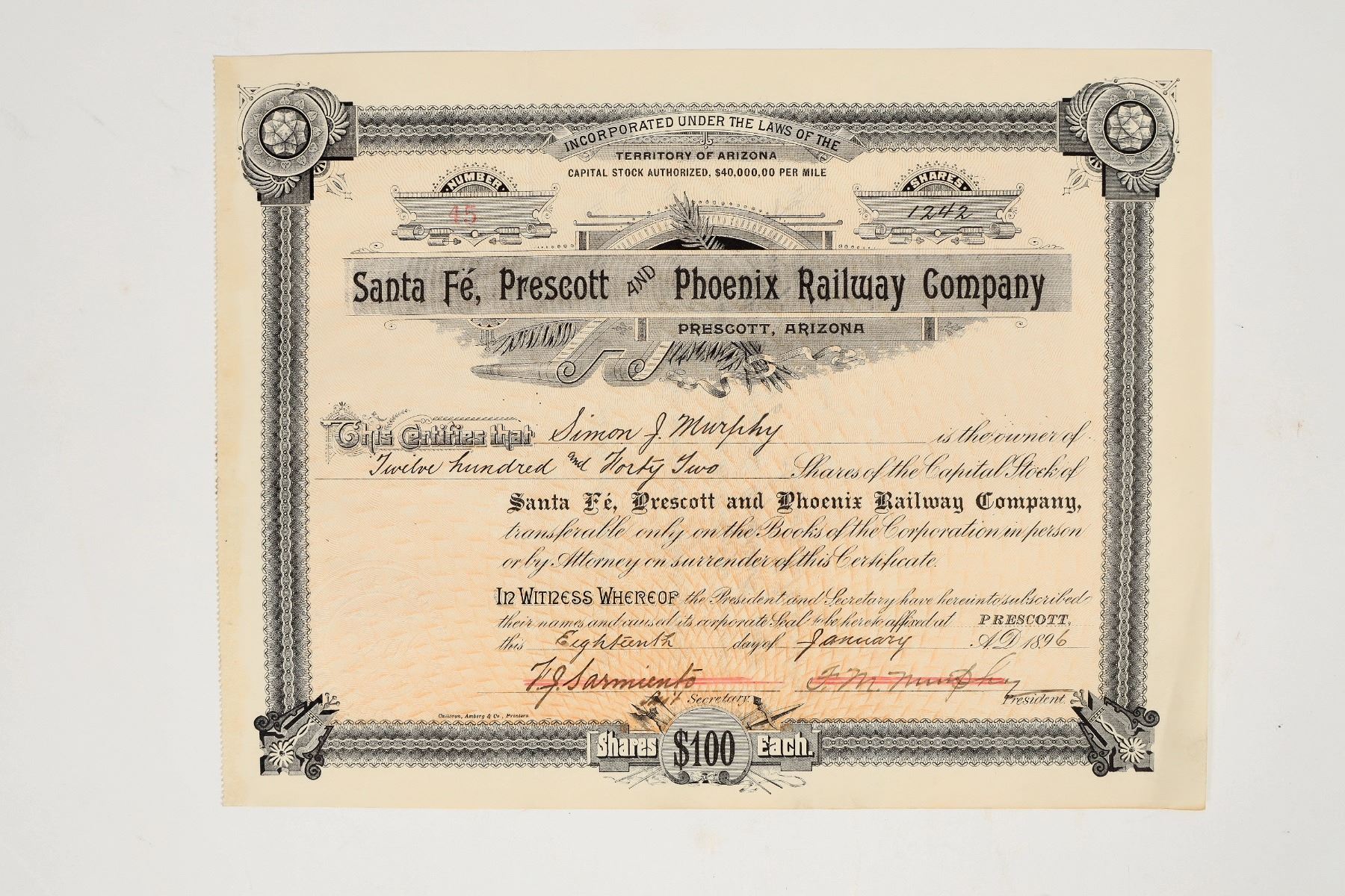 We've sold passes, but never a stock from this rail! Inc. in the Territory of Arizona. No. 45, issued for 1242 shares to Simon J. Murphy in Prescott in 1896. Signed by president FM Murphy and secretary Sarmiento. Pen cancelled. Ornate border, green underprint design. Folds, glue residue on left border where it came out of the ledger. Comes with the stub. Charted in 1891. By 1893, the line had reached from Ash Fork to Phoenix. Through subsidiary railroads, it served several mines in the Prescott area.