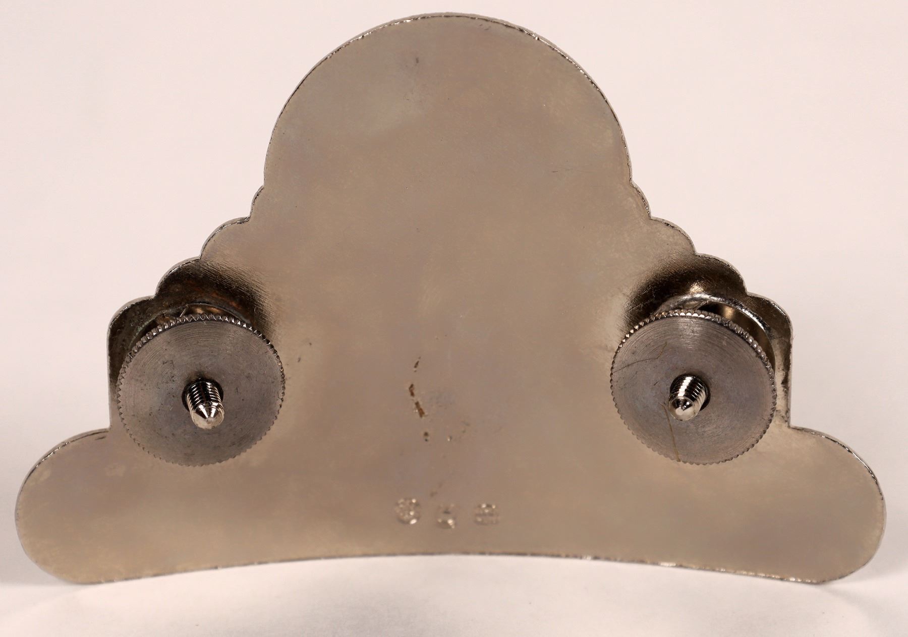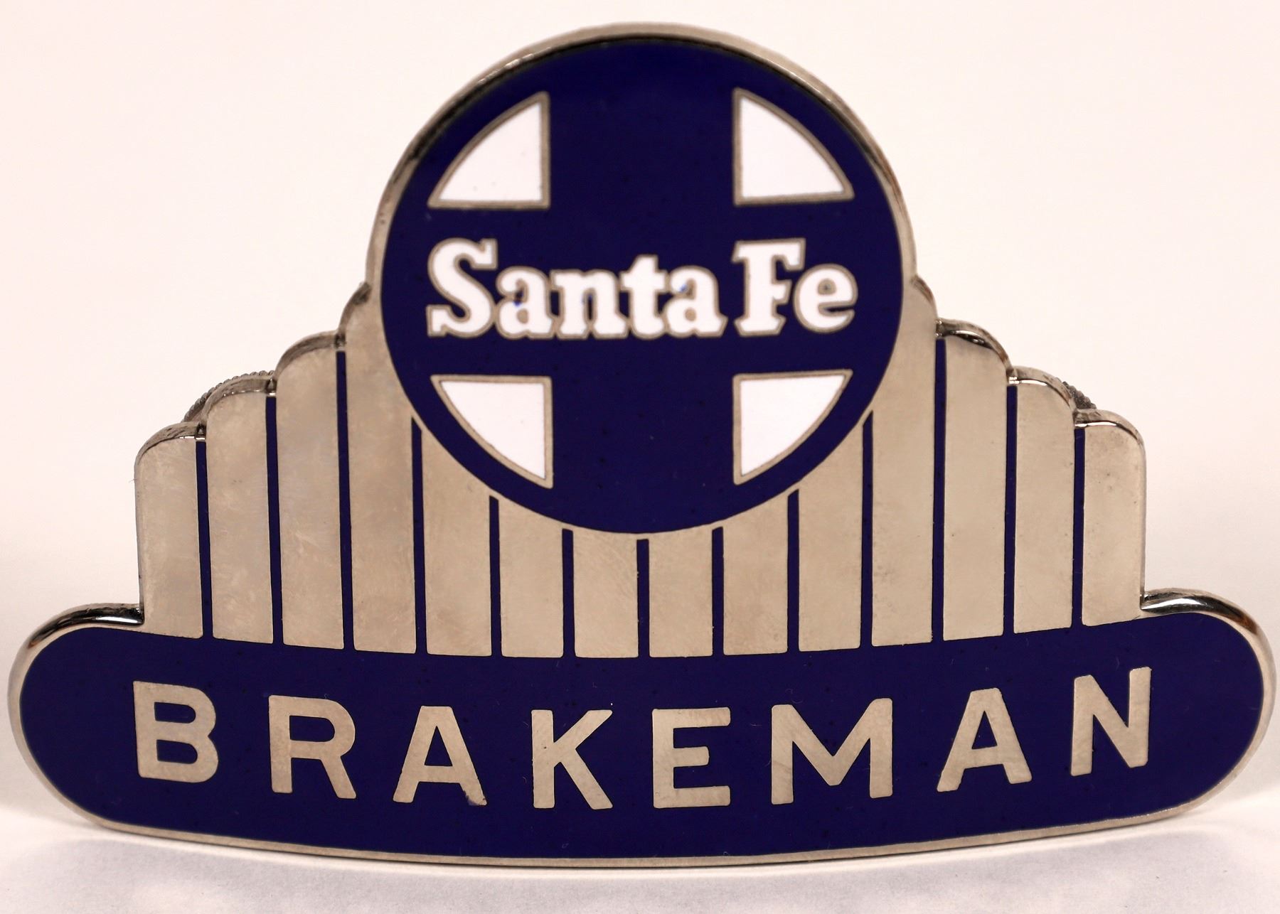 Brakeman Hat Badge for the Santa Fe Railroad, silver-toned with white and navy-blue enamel. Three symbols on reverse for International Jewelry Workers Union No. 9, and MPB / PIU – the Metal Polishers & Buffers Union and Platers International Union. Approx 3-1/4 x 2-1/2 inches.