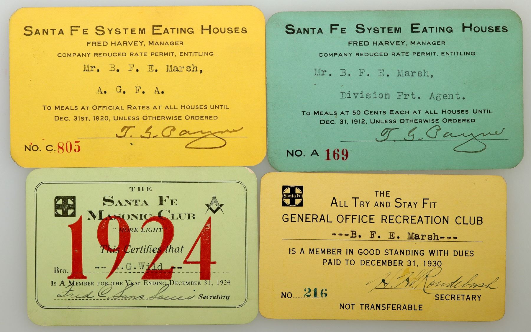 Lot of 4 different. This is a rare group of passes for clubs associated with the Santa Fe railroad system. 1-2) Two different passes for the Santa Fe Eating Houses, Fred Harvey, manager, 1912 and 1920. Signed by TG Payne. 3) Santa Fe Masonic Club member pass, 1924. Signed by the secretary. 4) Santa Fe "All Try and Stay Fit General Office Recreation Club" member pass, 1930. Signed by the secretary.