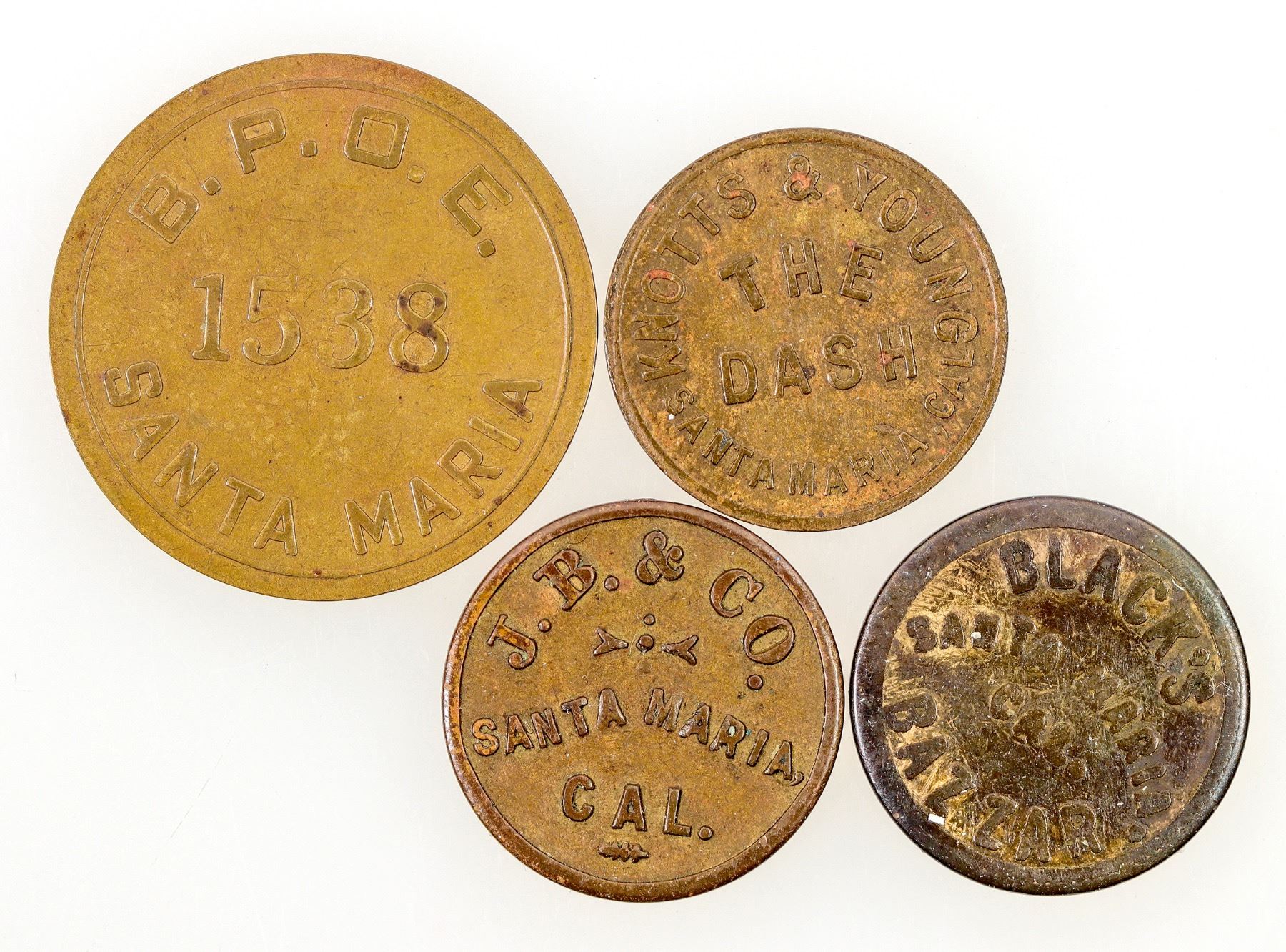 4 Santa Maria tokens, JB& Co. BPOE. Black's Bazaar. Knot's & Young. Santa Maria California
