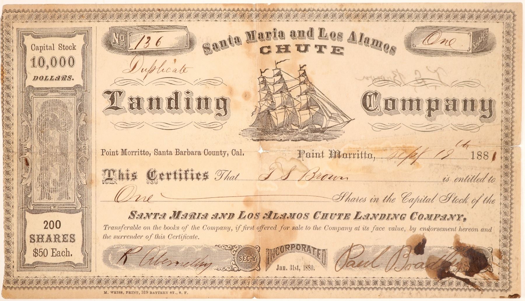 Here is an interesting stock. # 131 for 1 share to TS Brown. Signed by R Abernethy and president Paul Bradley. Dateline Point Morrito, September 18, 1881. Incorporated January 31, 1880. Not cancelled. Sailing ship vignette. Staining throughout, especially bottom right. M. Weiss, San Francisco printer. Hand written 'Duplicate'. If you don't know anything about Point Morritto, don's ask google. But you can find a few things using the California Digital Newspaper Collection. It seems there are two shipping points here. One is Point Sul and the other Point Morritto . Point Morritto is the favorite because of their improved facilities. It is seventeen miles from Lompoc. [Daily Press, Santa Barbara, July 9, 1881] Ken Prag Collection