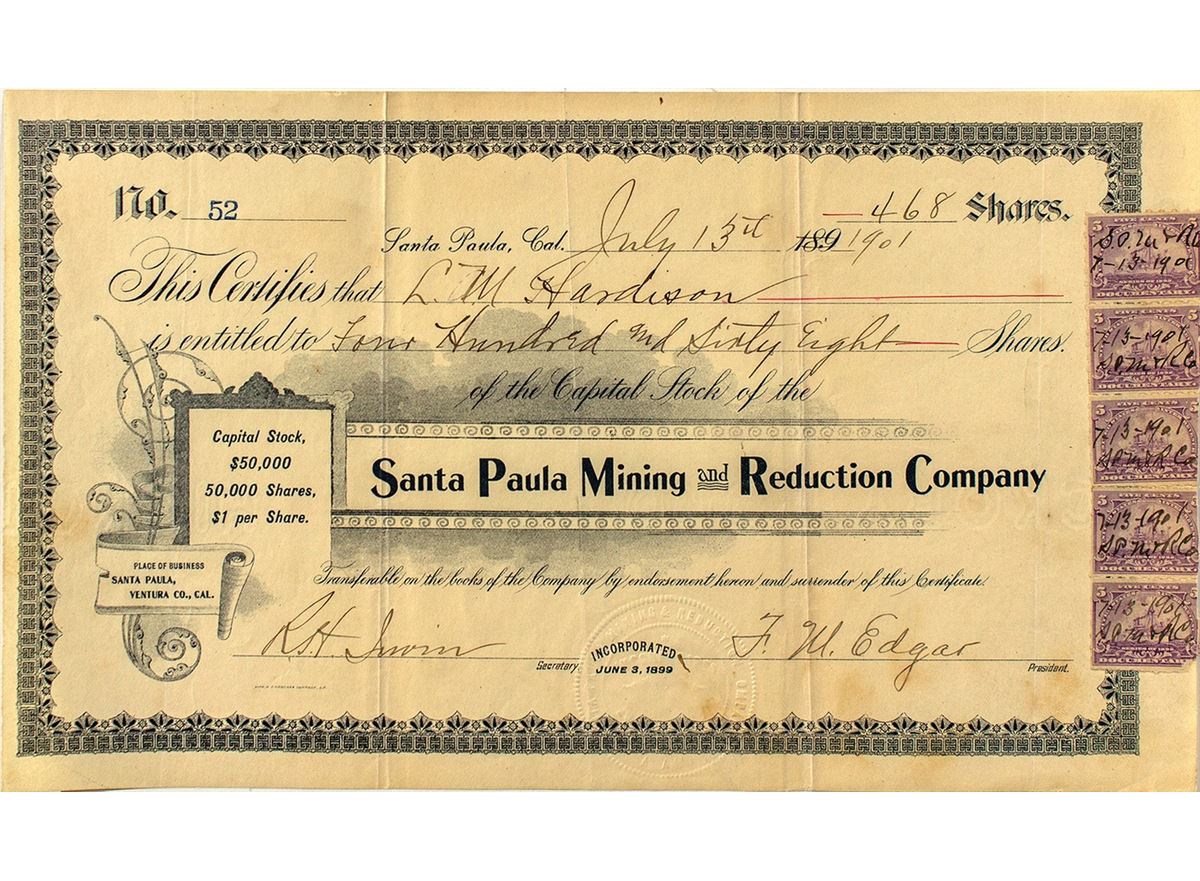 Cert. #52, issued in 1901 to L.M. Hardison for 468 shares. Signed by F.M. Edgar as president and R.H. Irvin as secretary. The company held a valuable group of mines, north of Borax Lake, in the Argus Mountain range, 26 mi. northeast of Randsburg, in Inyo County. The Santa Paula group consisted of the Comet, Starr, Santa Paula, and three others, all in the same locality. In 1898, a large quantity of ore was on the dump, with assays between $38.50 and $126 per ton. The ore was stained with copper and also contained some silver. The Santa Paula was on a steep hill side, about a mile distant, and showed a large body of ore. In 1898, the company was just starting to develop the Santa Paula mine and also intended to develop the Kilmer claim, about 3 miles away. An assay of the Kilmer had shown $67.18 in gold and $1.50 in silver per ton (Mining & Metallurgical Journal, October 1, 1897, pp. 9-10). Five documentary revenue stamps at right. Fold lines. Uncancelled.