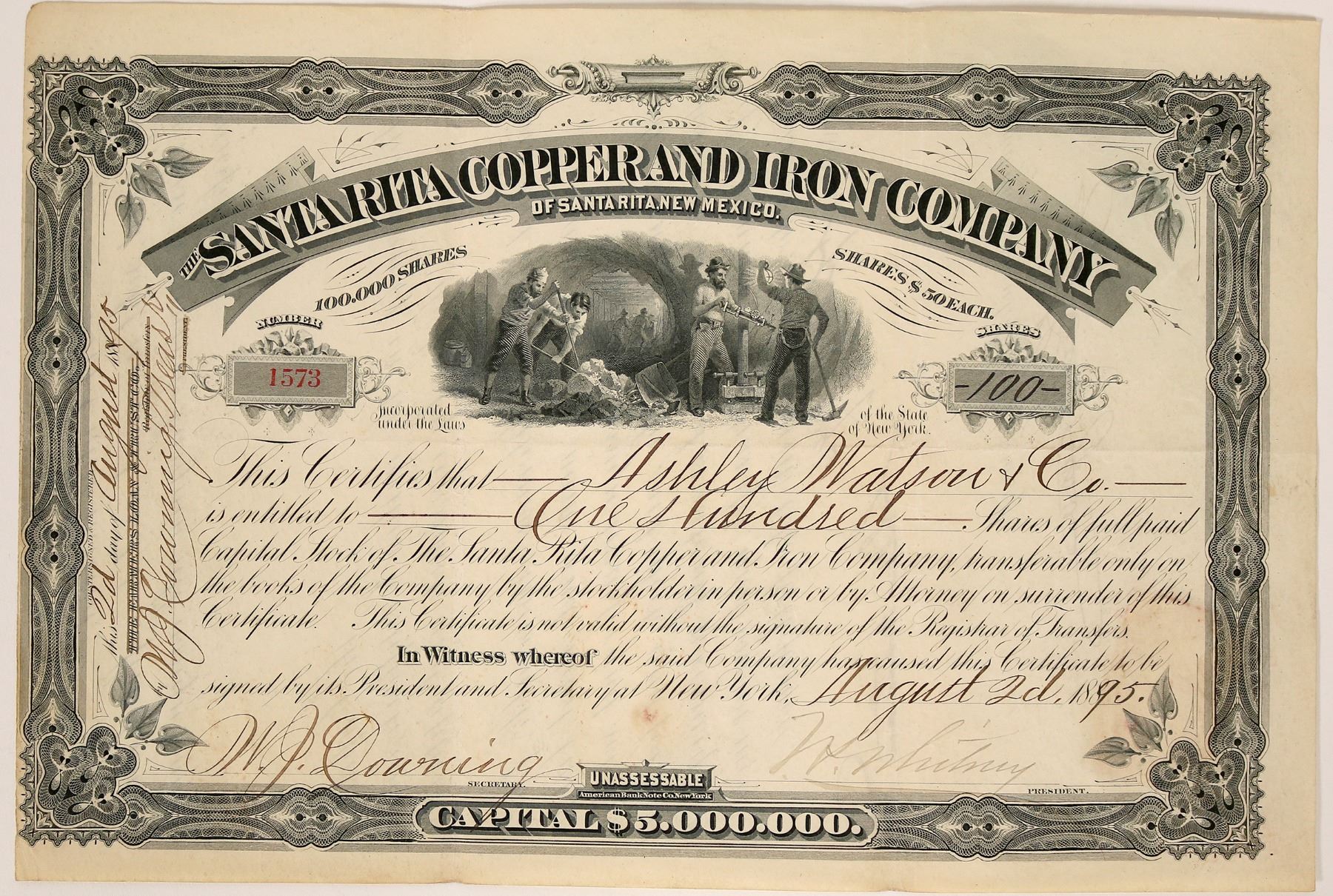 # 1573 for 100 shares to Ashley Watson & Co. Signed by WJ Downing and president JP Whitney. Not cancelled. $1.00 green documentary stamp on reverse. Underground mining vignette. American Bank Note printer. Dog ear corners, one stain center bottom. The Santa Rita district was one of the oldest mining districts in the west and ranks next to the Lake Superior district of Michigan as the earliest known copper district within the territories included in the United States. According to J.P. Whitney, croppings of native copper were discovered by an Apache Indian in the later 18th century. After the find was reported to Colonel Carrasco of the Spanish army, a contract was made to supply copper for the Mexican coinage (Likely about 4,000,000 lbs. annually). In 1897, the Hearst family took a lease on the properties to supply sulphide ores to its smelter in Silver City. Through 1904, the total production of the Santa Rita mines was estimated at 80 million lbs. (USGS, Prof. Paper Issue 68, Ore Deposits of New Mexico, p. 306) Ken Prag Collection