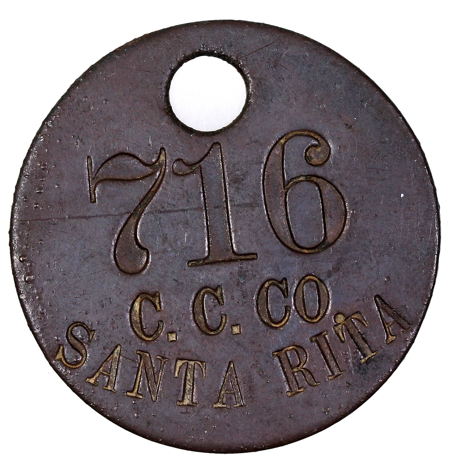 Key tag from the Santa Rita Mine in New Mexico. This mine was started by the Chino Copper Company in 1909. The key tag says, "716/ C.C. Co./ Santa Rita." Circular shape, approx. 1.25 inches in diameter.