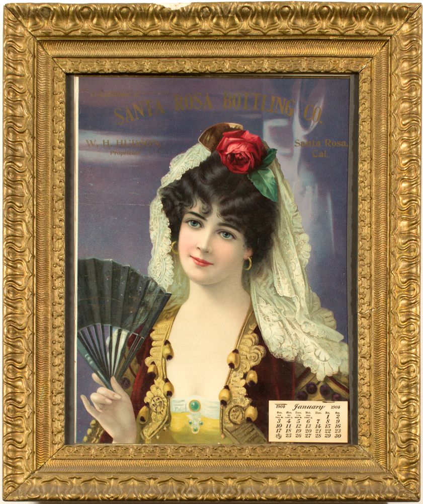 W.H. Hudson, Proprietor. Santa Rosa, Cal. Jan. 1904. Broadside features an elegantly-dressed woman, perhaps royal, with black hair, blue eyes, a rose in her hair and a fan spread between her fingers. Gold lettering and blue background. Small calendar bottom right corner. Broadside measures 14" x 19" in a 22" x 26" frame. Burt Collection