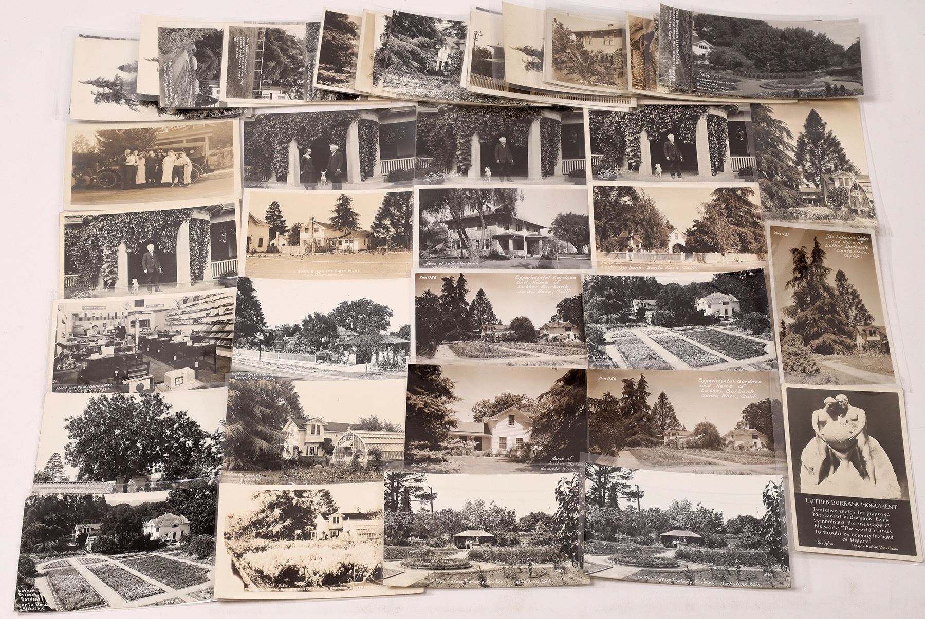 44 RPC's of Luther Burbank, his home and his gardens in Santa Rosa, California. Some highlights include views of Burbank on his porch with his dog (3), one with his dog and his wife, and a family photo in front of an old car. Luther Burbank (March 7, 1849 – April 11, 1926) was an American botanist, horticulturist and pioneer in agricultural science. He developed more than 800 strains and varieties of plants over his 55-year career. Burbank's varied creations included fruits, flowers, grains, grasses, and vegetables. He developed (but did not create) a spineless cactus (useful for cattle-feed) and the plumcot (wiki). City: State:California Date: