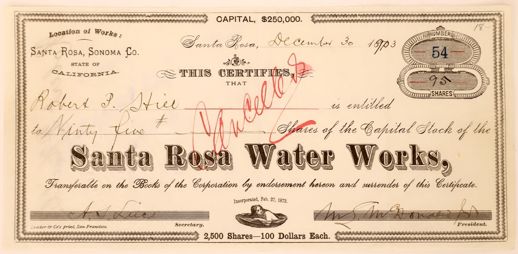 Issued 1903 Santa Rosa Water Works stock. Santa Rosa California Ken Prag Collection