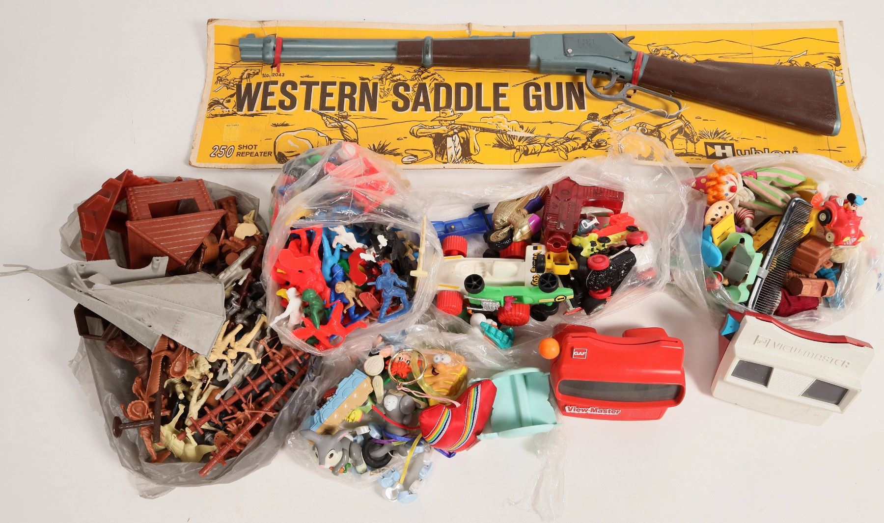 lot of 85 plus. Five plastic bags containing toy solders. race cars, western forts fences, cowboys, Indians and small characters. Roy Rogers Yo-Yo's w/display box, Lost In Space mini robot, Western Saddle Rifle and Texan 45 cap guns NIB, Luger style cap gun NIB, HO scale road signs, two ViewMaster viewers and more.