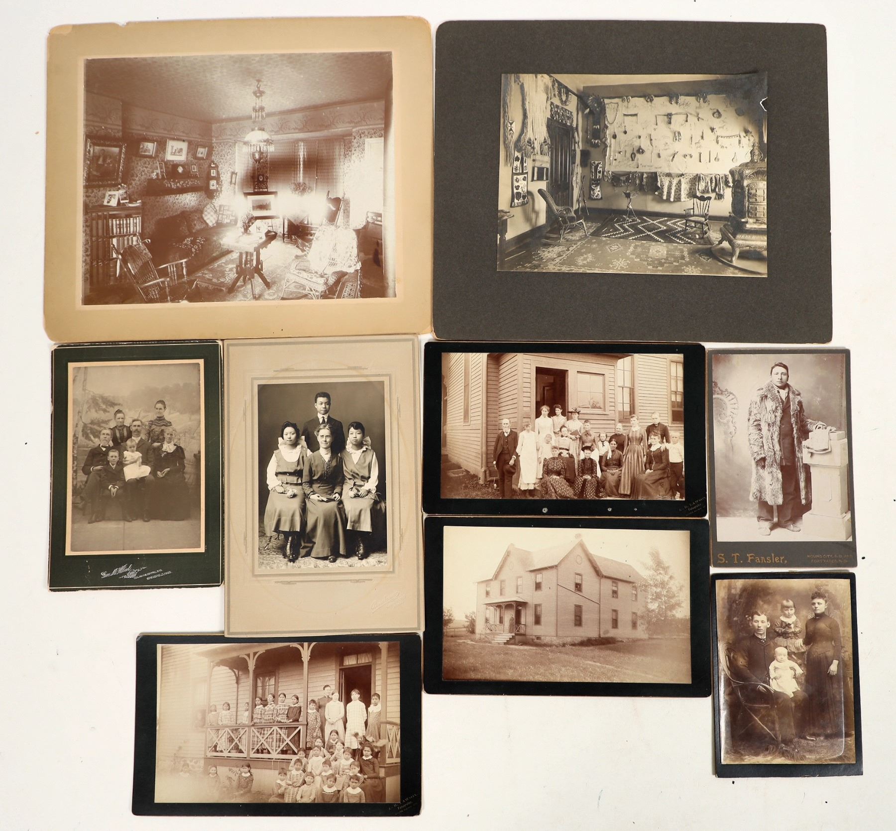 Lot of 9. Vintage photos of Dr. Fred Riggs family, staff and Sioux Indians of Santee Indian Agency Fort Yates Nebraska. B/W and sepia tone hard mounted photos. All in excellent condition. Two Large 10 x 11" hard mounted photos of the sitting rooms at Fort Yates agents house. One 4x7 S.T. Fansler photo of Fairfield Driver. Included are background stories on the individuals and the fort.