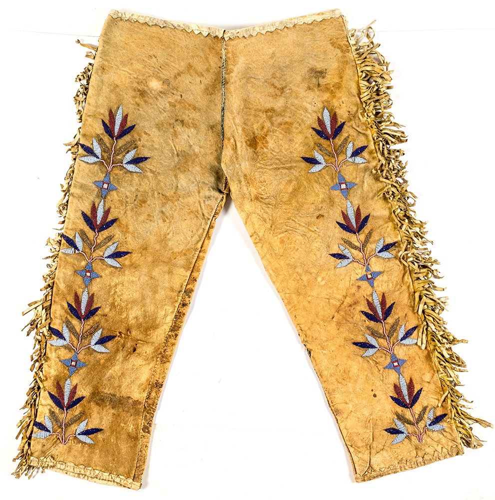 c. 19th century. Dark blue and yellow dot full cloth lining. Sioux. Beaded design on front of legs. Approx 17" long, child sized. Consigned by The Cowboy Connection in Livingston, MT. State: City: Date: ID# 49822