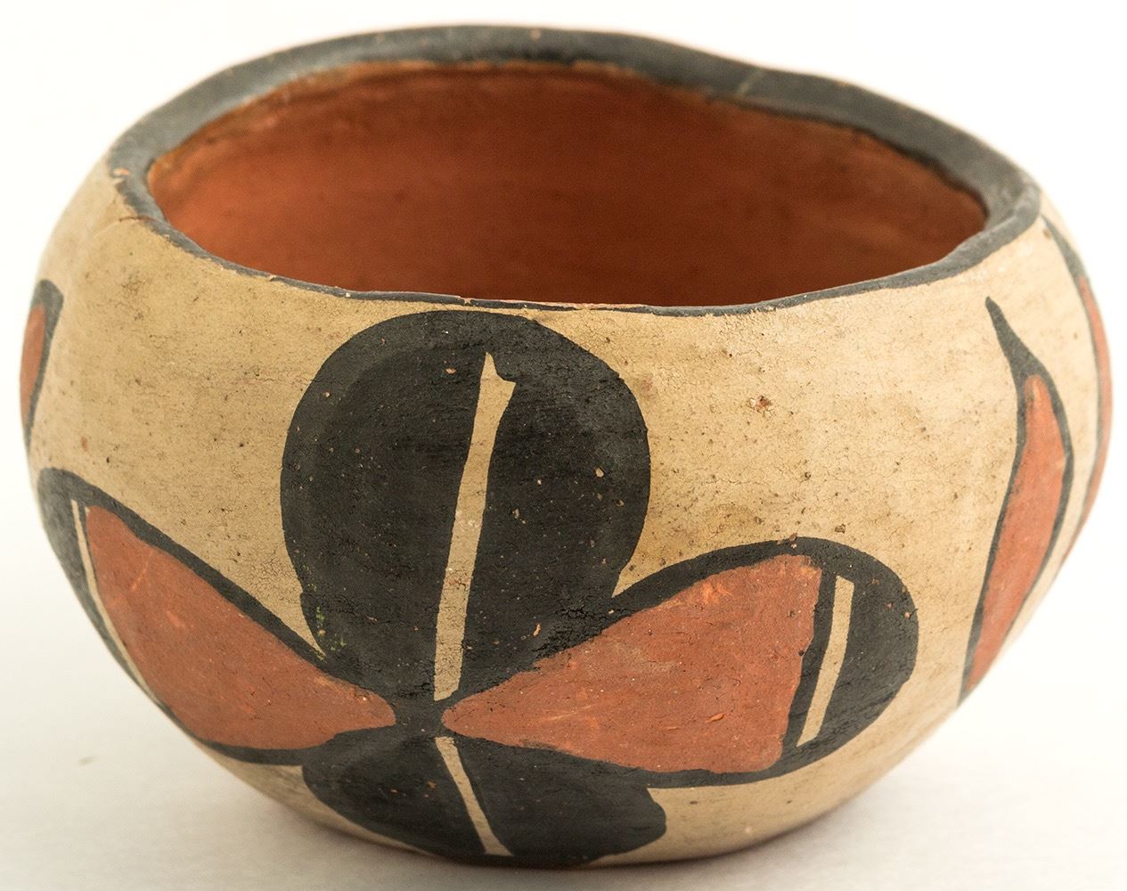 Small Santo Domingo bowl, unknown artist. 2.25" h x 4" diameter. Flower design. State:New Mexico City:Santo Domingo Date:c.1930's ID# 49410