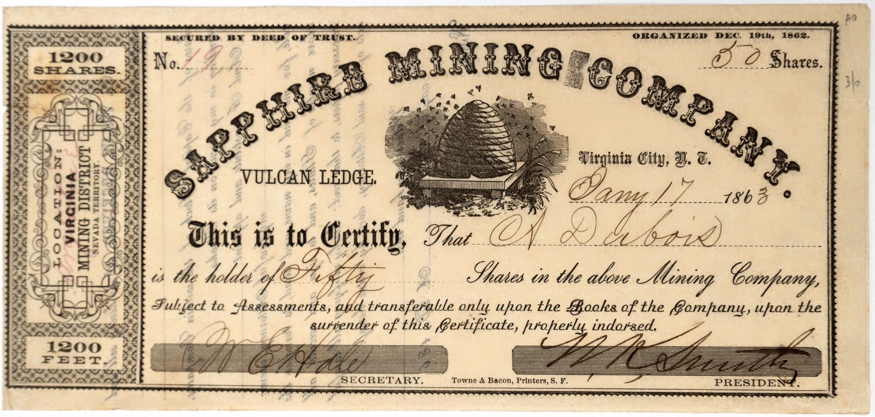 RARER date, company and district! Early certificate! # 19 for 50 shares to A. Dubois. Dubois would perish with most of the passengers in September of 1864 in the Washoe Paddle Wheeler explosion while travelling from Sacramento to San Francisco. Signed by W. E. Hale secretary and W. K. Smith president. Dateline Virginia City, January 17, 1863. Organized December 10, 1862. 1200 shares / 1200 feet! Secured by Deed of Trust (We haven't seen this before!) Location: Vulcan Ledge. Beehive vignette. Towne & Bacon printer. Not cancelled. Edge nick and light staining left border. Hand written over the 'Virginia Mining District' is 'Argentine Mining District.' In January of 1864 the Gold Hill Daily News reported on this district. It attracted a good deal of interest in 1859. A number of ledges were located and some work was done. But soon afterwards but a single claim remained that was being worked. (Historical notes on the steamer explosion and Argentine district included.)