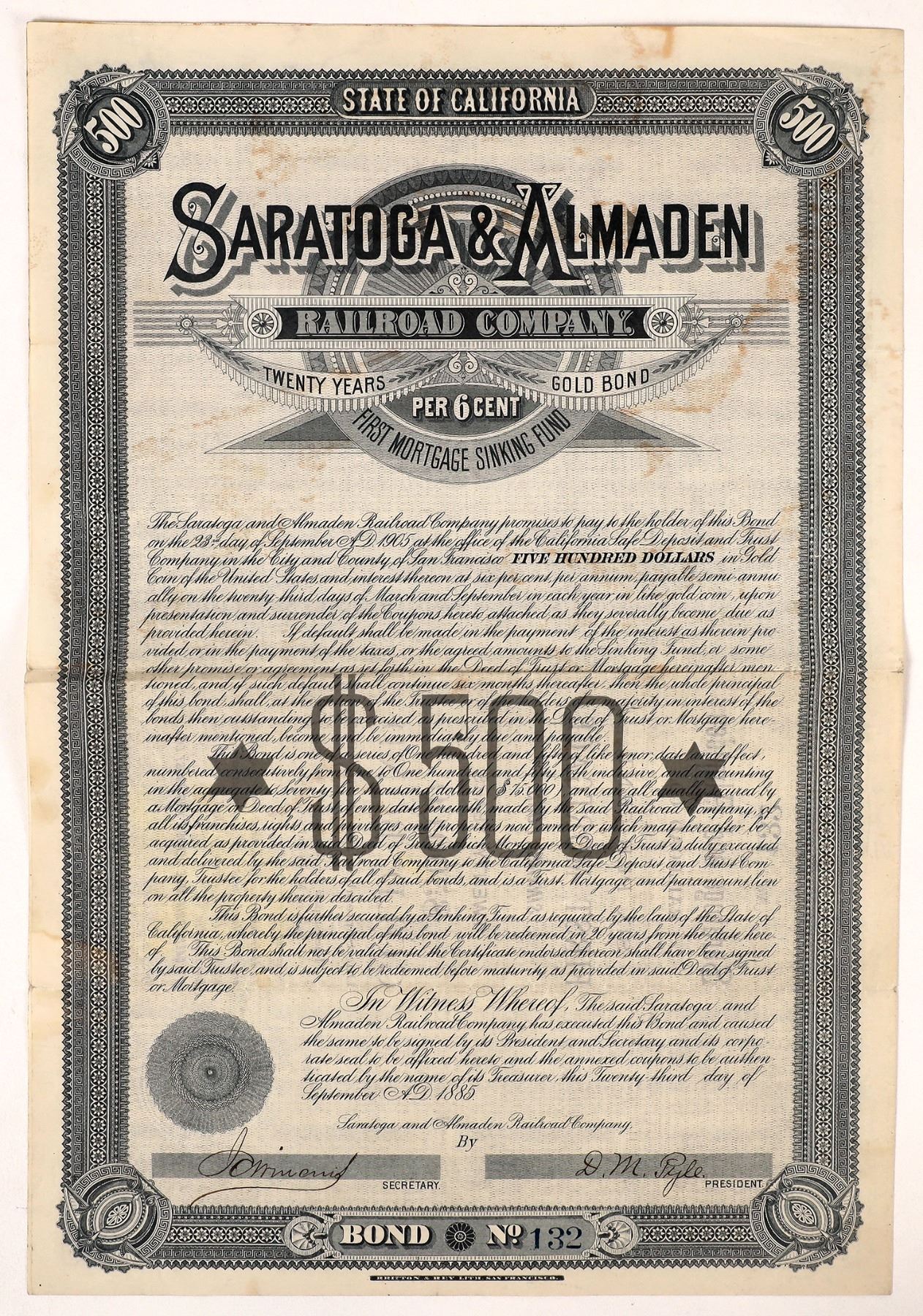 Scarce, California railroad bond from the Saratoga & Almaden Railroad Company issued in 1885 for $500. Cert. #132. Twenty year gold bond, 6% interest. Forty coupons attached at the right. Signed by D.M. Pyle as president. Britton & Rey, S.F. Lithographer.