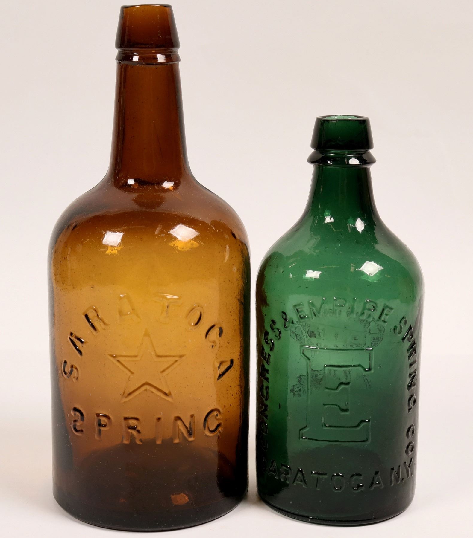 Quart amber "Saratoga/ (star)/ Spring with backwards "S". Rare. appears Mint. Also Congress 7 Empire Spring pint, Empire Wtaer, in the usual deep green.small base chip.