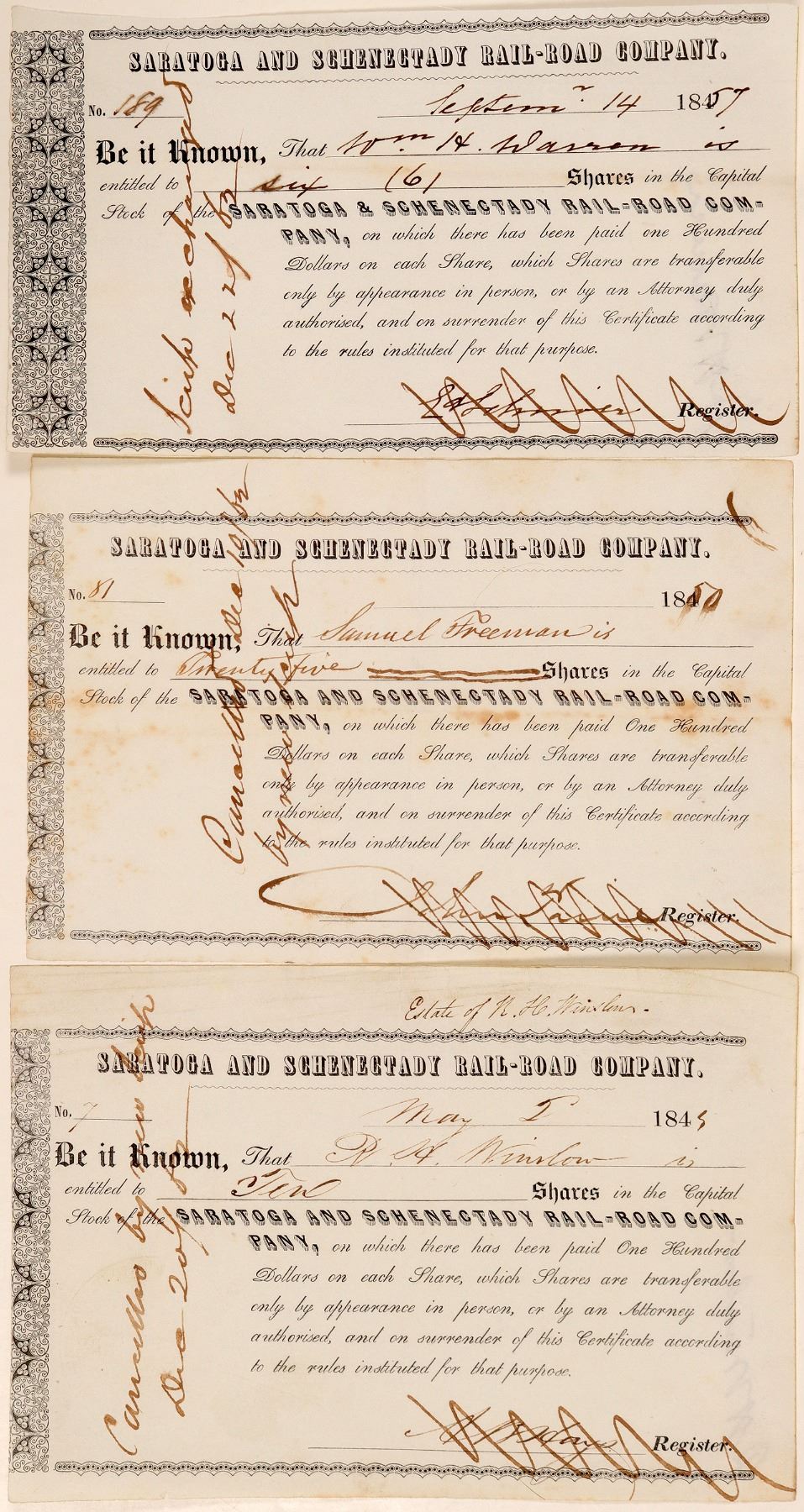 3 certificates. Incorp. February 16, 1831 New York . The line was opened for a total of 20.8 miles. All I/C, $100 par shares, BLACK on white paper. Ornamental design on left. Title ; hollow lettering w/shadow. Embossed seal w/ cab-less loco center. Unknown printer. #7, 10 shares issued to R.A. Winslow May 5. 1845, signed A.B. Hayes Register. #81, 25 shares issued to Samuel Freeman 1850, signed John Taine Register. #189, 6 shares issued to Wm. H. Warren Sept 14, 1857, signed L. Lehmier Register. Dates of known issue were originally thought to be 1849-1860, making the 1845 issue rare. VF Ken Prag Collection