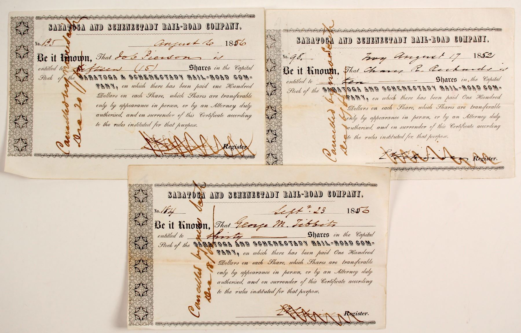 3 total certificates. All signed and canceled; illegible signature on the registers signature line. All are in very good condition, small bends on the left, lower edges. The Saratoga and Schenectady Railroad was incorporated on February 16, 1831. The founders were Henry Walton, John Clarke, William A. Langworthy, John H. Steele, Miles Beach, Gideon W. Davison, and Rockwell Putnam. The line was opened from Schenectady to Ballston Spa on July 12, 1832, and extended to Saratoga Springs in 1833 for a total of 20.8 miles.