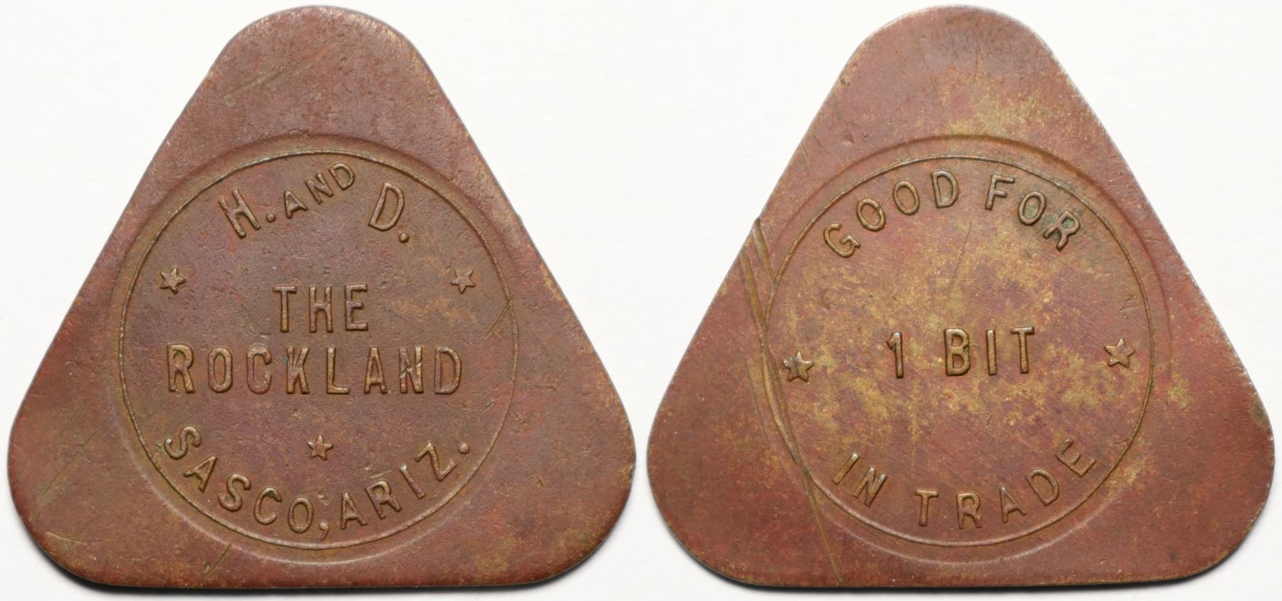 H. and D. / The / Rockland/ Sasco, Ariz. // GF / 1 bit / IT. Triangle, br. Sasco's post office was established July 10, 1907 and was discontinued September 15, 1919. Sasco stands for Southern Arizona Smelting Company.