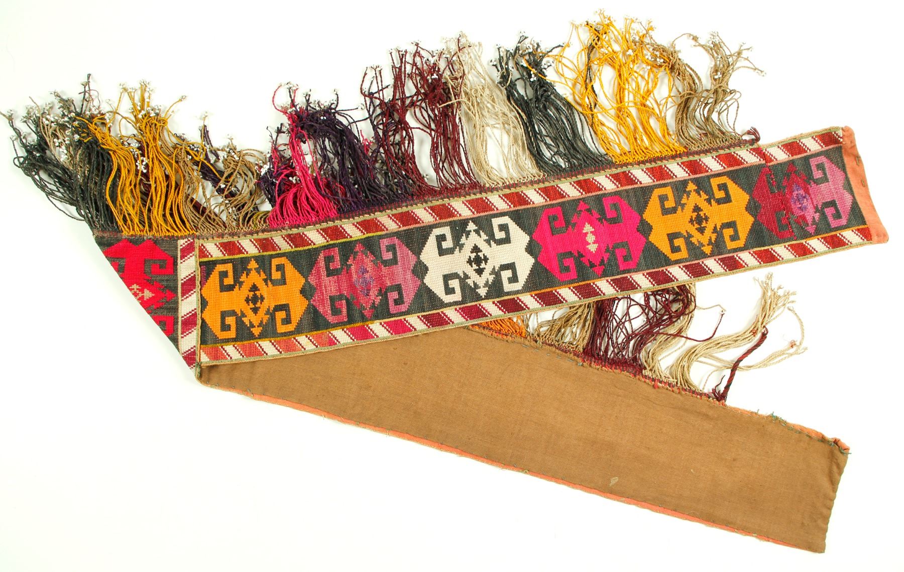 Beautifully made sash with fringe & detail. Geometric designs in bright colors. Approx. 50 x 4.5". Russia 1900s Ben-Tcahvtchavadze collection of Ontario, Canada