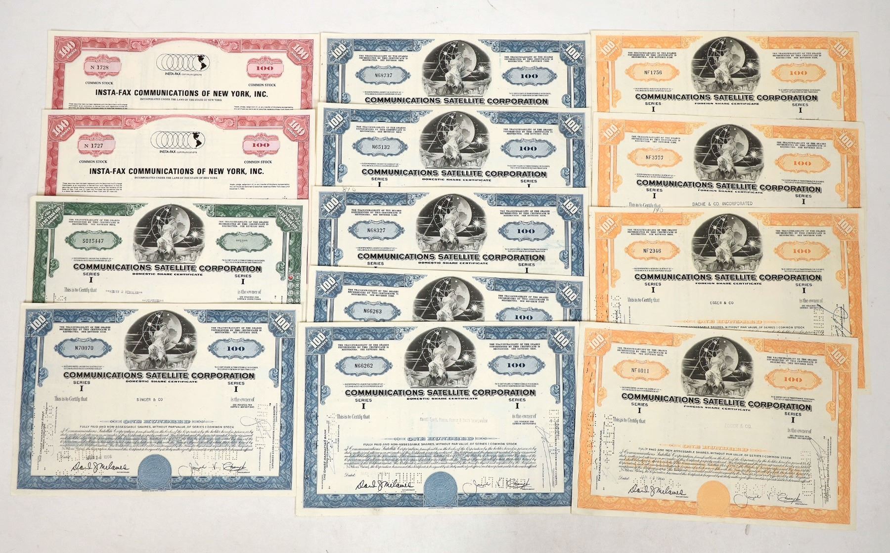 Issued-Communication Satellite Corp 1968-68, 4x orange, 6x blue, 1x green. 3x 1968 Insta-Fax Communications of NY.
