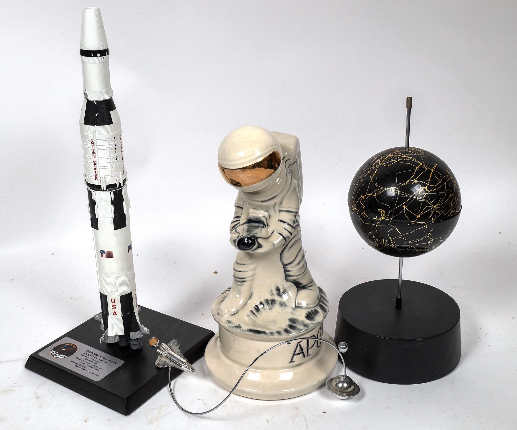 Plastic Saturn V model, 15", missing top modules, plastic engine nozzle detached, can be reglued. Thomas W Sims Bourbon astronaut decanter 12", empty. Black plastic globe? on base 12".