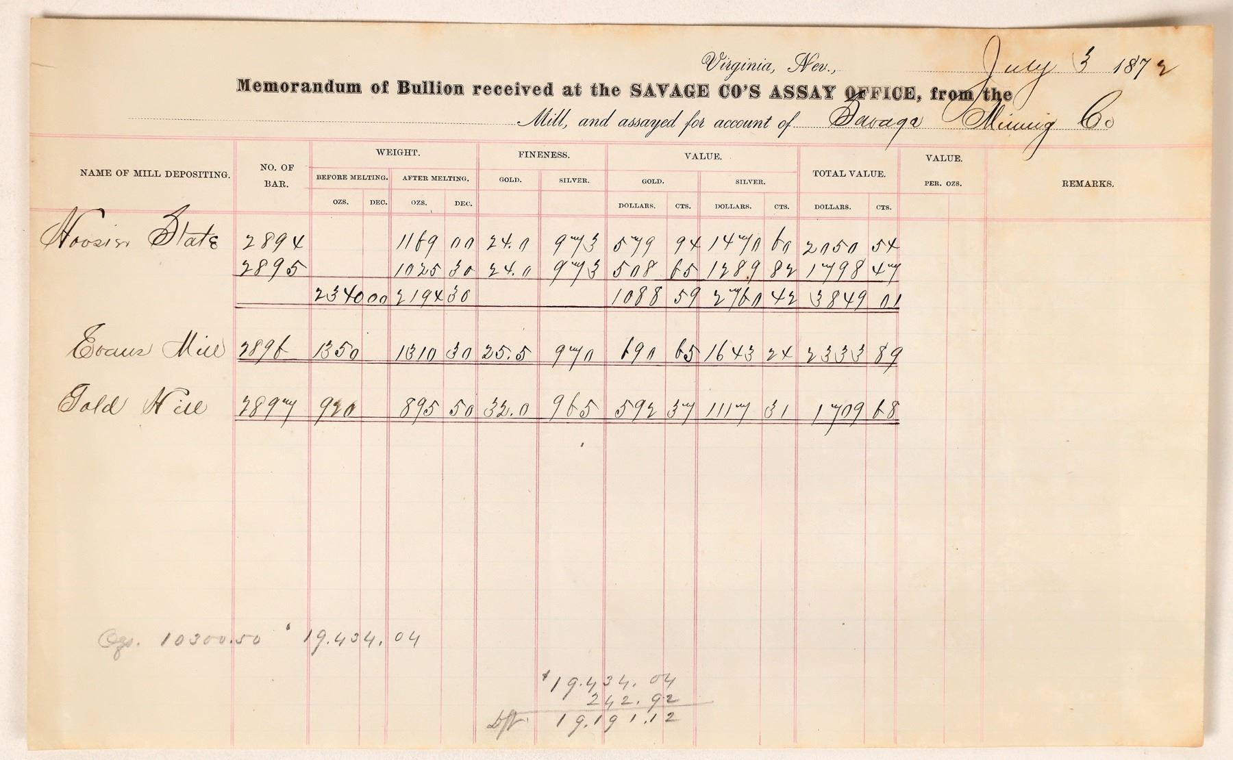Memorandum of Bullion received at the Savage Co's Assay Office, Virginia, Nev., July 3rd, 1872. Deposits from the Hoosier State Mill (located on Silver St. in Virginia City), Evans Mill (Sevenmile Canyon near the Sierra Nevada Mine), and Gold Hill Mill. Four bullion bars, nearly $8,000 in value. Not signed by the assayer. 7.5 x 12" Folds, some discoloration. Rare. Virginia City Nevada Franklin Collection