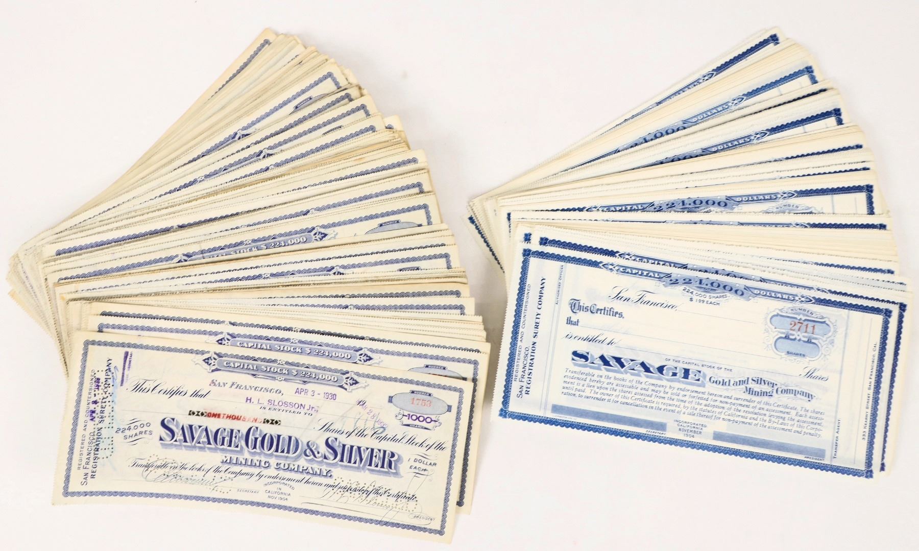 Group of approx. 300 stock certificates from the Savage Gold and Silver Mining Company, which mined Nevada's famous Comstock Lode, issued 1927 to 1932. Lot includes about 50/50 split of issued and unissued certs; all issued pieces are cancelled. 10"x4" certificates; unissued pieces in pristine condition, issued pieces with some light toning/staining. See photos.