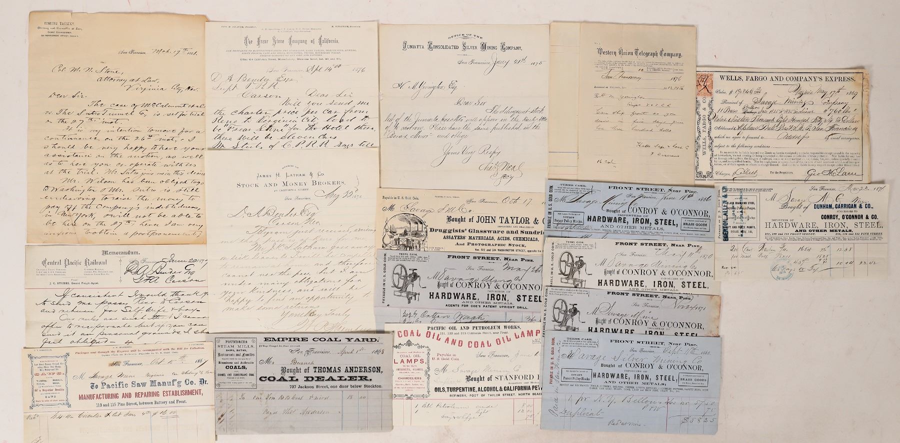 About 21 Savage Mine and Virginia & Truckee Railroad etc items. c. 1866-88. Billheads, Western Union telegraph to H M Yerrington, Wells Fargo and Co's Express, Pacific Saw, Sutro Tunnel lawsuit attorney letter etc. Virginia City Nevada