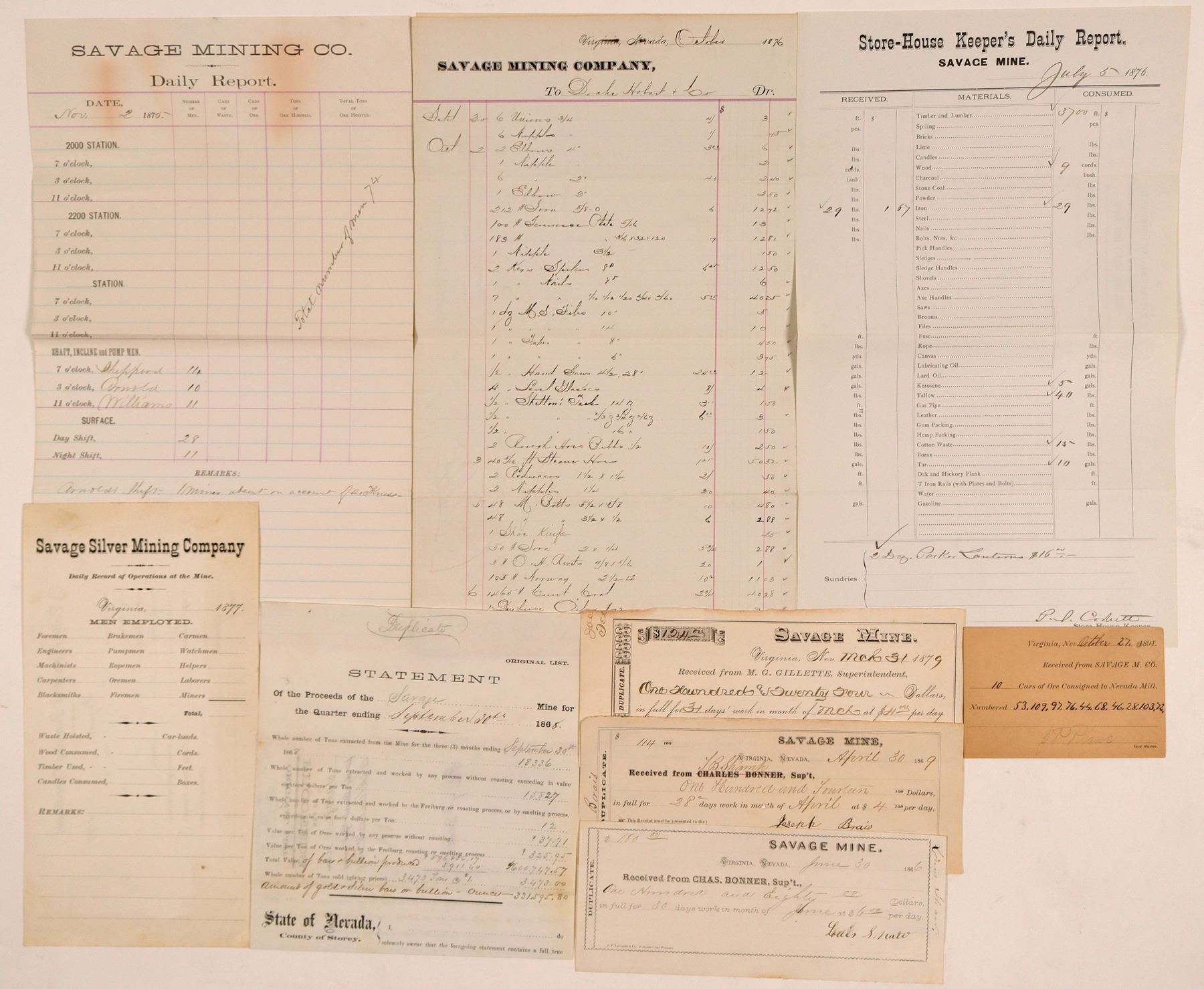 Lot of 9. 1) 1868 Statement of ore produced for the quarter ending Sept. 30th, 1868. 18,336 tons of ore extracted from the mine. Amount of gold & silver bars or bullion: 331,595 ounces! 2) Three different Mine Reports: 1875 Daily report; 1876 store-house keeper's daily report; and 1877 Daily Record of Operations (unused). 3) Multi-page billhead for goods purchased from hardware dealers Doake, Hobart & Co., 1876. 4) Three different paychecks: 1866 Chas Bonner, 1869 TB Shamp, and 1879 MG Gillette. 5) 1891 ore card for cars delivered by the mine to the Nevada Mill. (Sutro-Comstock Collection)