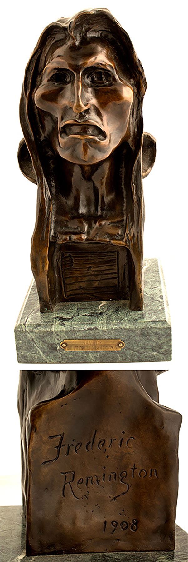 Reproduction of bronze sculpture, ''Savage" by Frederick Remington. 9.5" x 4.75" x 5". Mounted on marble base. Date: 1908 City: State: HWAC# 49730