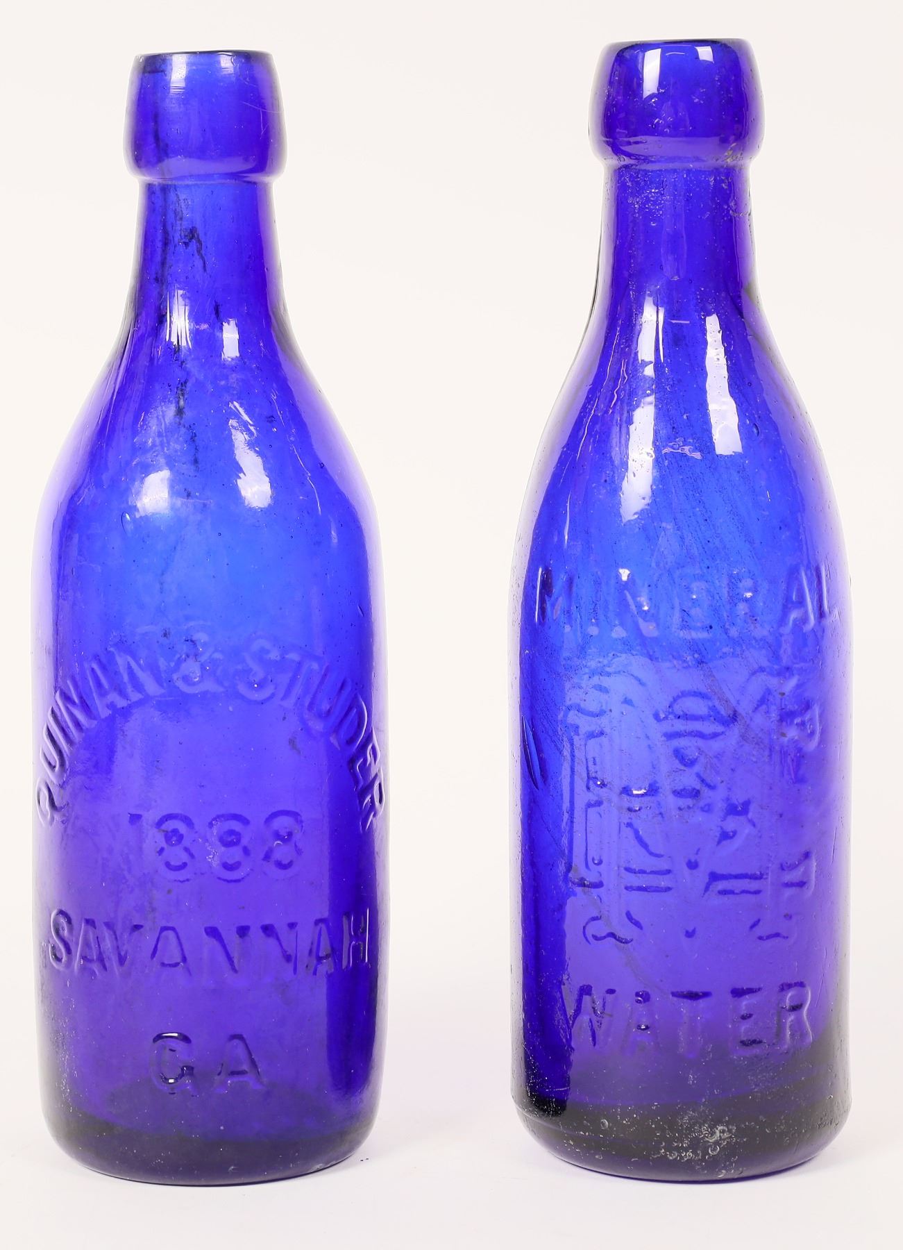 2 dark cobalt Savannah bottles. Quinan & Studer, 1888 soda. Meincke & Ebberwein, 1882 mineral water. No apparent chips or cracks. Savannah Georgia c. 1882