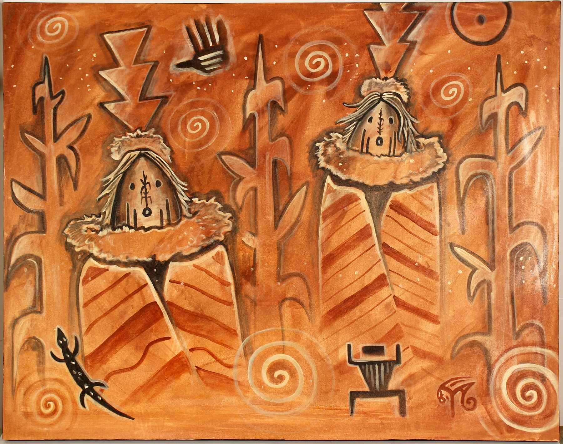 "Saved Seeds" original oil by Elriggs Allen. Inscribed on canvas reverse "In the Navajo tradition the Yei-be-ches were the Spirits who found the 1st human child and raised his as their own feeding? him chants and prayers that are still used this day w/ corn poll en as the offering". I was born in the canyons of Arizona on a cold February morning. my first masterpieces were at the age of I which were mere scratches n the sand. by the age of three I was observing all colors and moved into the field of crayons a medium in which I still dabble at times. by the age of five I was drawing in the art of pencil and engaging in realism. Drawing horse and the land I lived on.......I still have pictures. by the age 10 I had adapted shadowing and lighting my works ....and won small art compactions in my age group. at 15 I had taken in all that public school art course's could offer.. and won several art shows in high school ( new Mexico and Nevada divisions. )I constantly worked at home in my room on my make shift drawing boards. dreaming one day of becoming an artist......then the world crashed...my father passed away and I became a person of fear...I put art away and turn to the world of constant problems...bills..work..time...buying stuffs, losing stuff, wanting more and more....this took me into the life of unconscious living. I lived in the unconscious world of fear for eight years. Till one day I ended homeless in the streets.........I had nothing left to lose.......and it was their in the darkness of life I had a grand vision ans God spoke to me for the very first time " telling me that all life was a dream and a spirit and I should grab it and claim for what I want for that was the purpose of my life.. to live it....to love it."...that night and that moment on the streets of phoenix I changed all my views and pity upon my self...and rose. I came back to the reservation with 1.40 cents in my pocket.......and I started painting on anything I could find....." from elriggsallenart.carbonmade.com. Artist signature below on reverse. 41.5x53".
