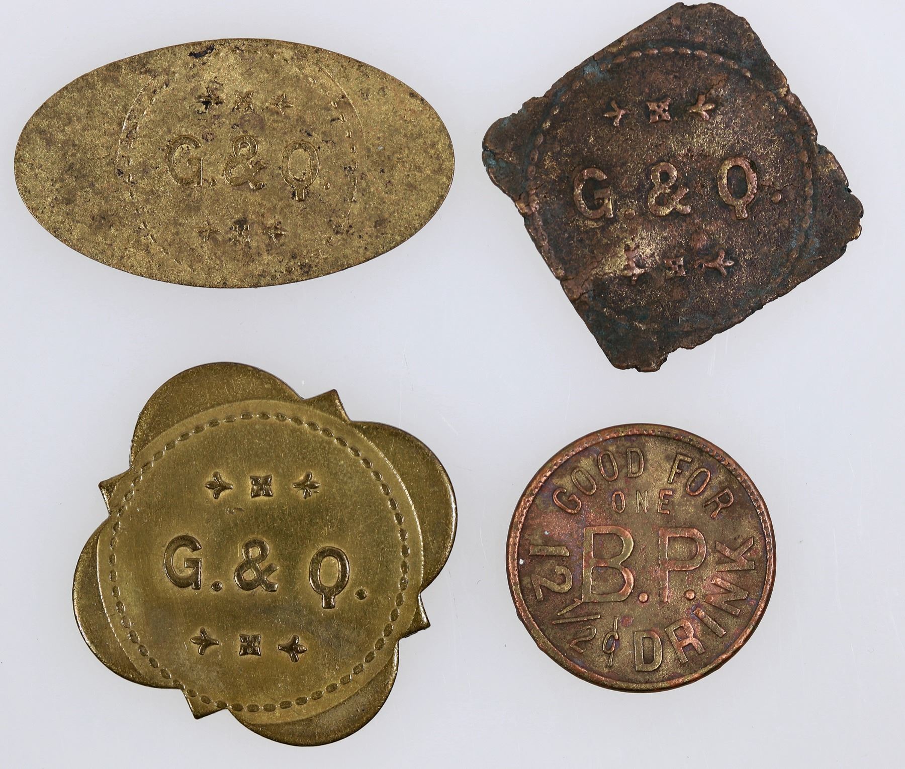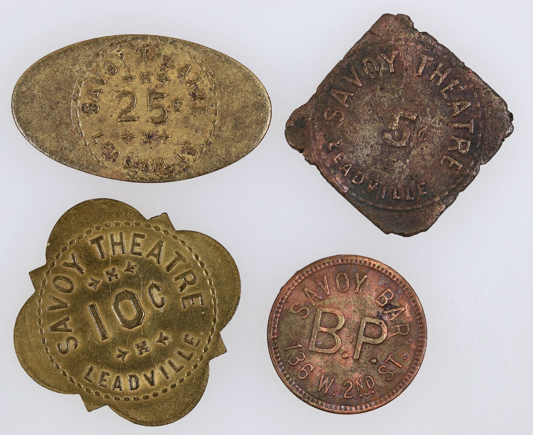 Lot of four tokens: 1) SAVOY BAR / B.P. / 136 W. 2ND ST. //GOOD FOR / ONE / 12Ω¢ DRINK / B.P. ; Br., rd., 21 mm. 2) SAVOY THEATRE / 25¢ / LEADVILLE / G. & Q // 25¢; Br., oval, 35 x 20 mm. 3) SAVOY THEATRE / 10¢ / LEADVILLE / G. & Q // 10¢; Br., Sc, 30 mm. 4) SAVOY THEATRE / 5¢ / LEADVILLE. // G. & Q.; Br., Sq., 24 mm.