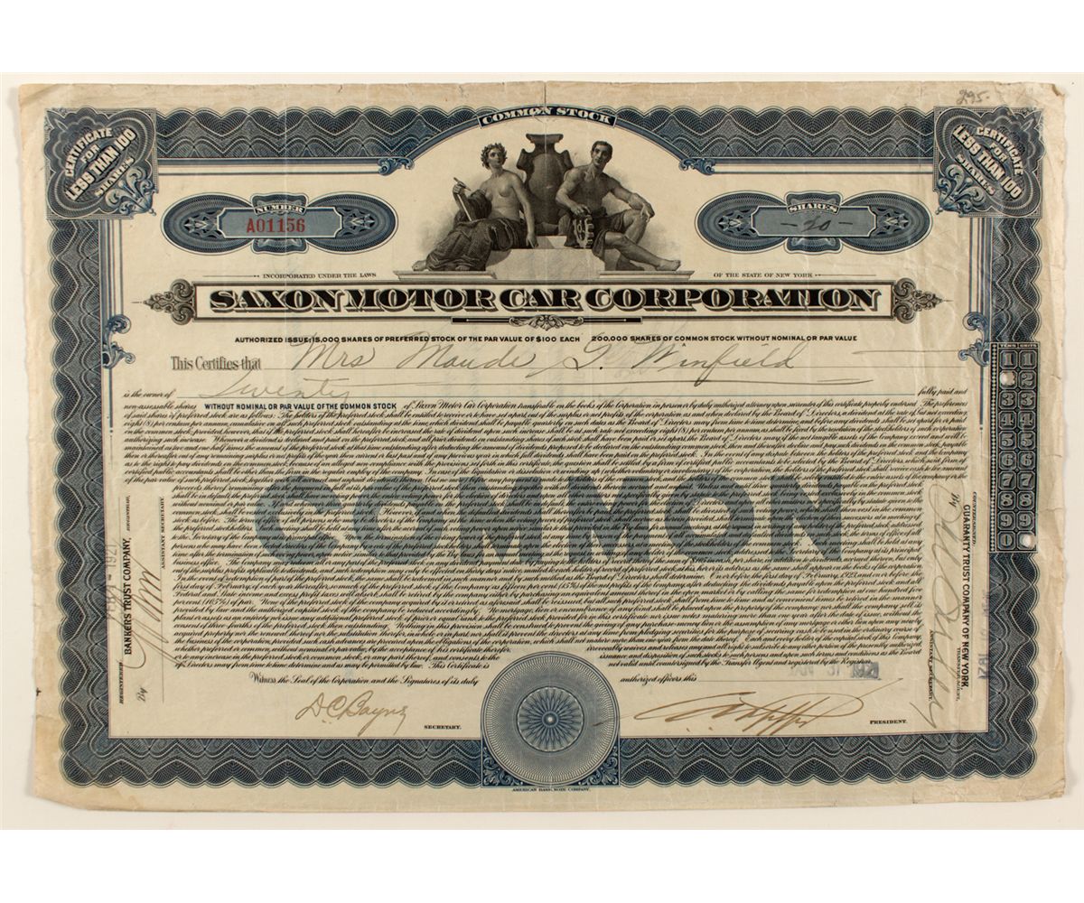 Cert # A01156 for 20 shares issued to Maude Winfield. Prag Collection