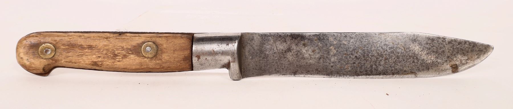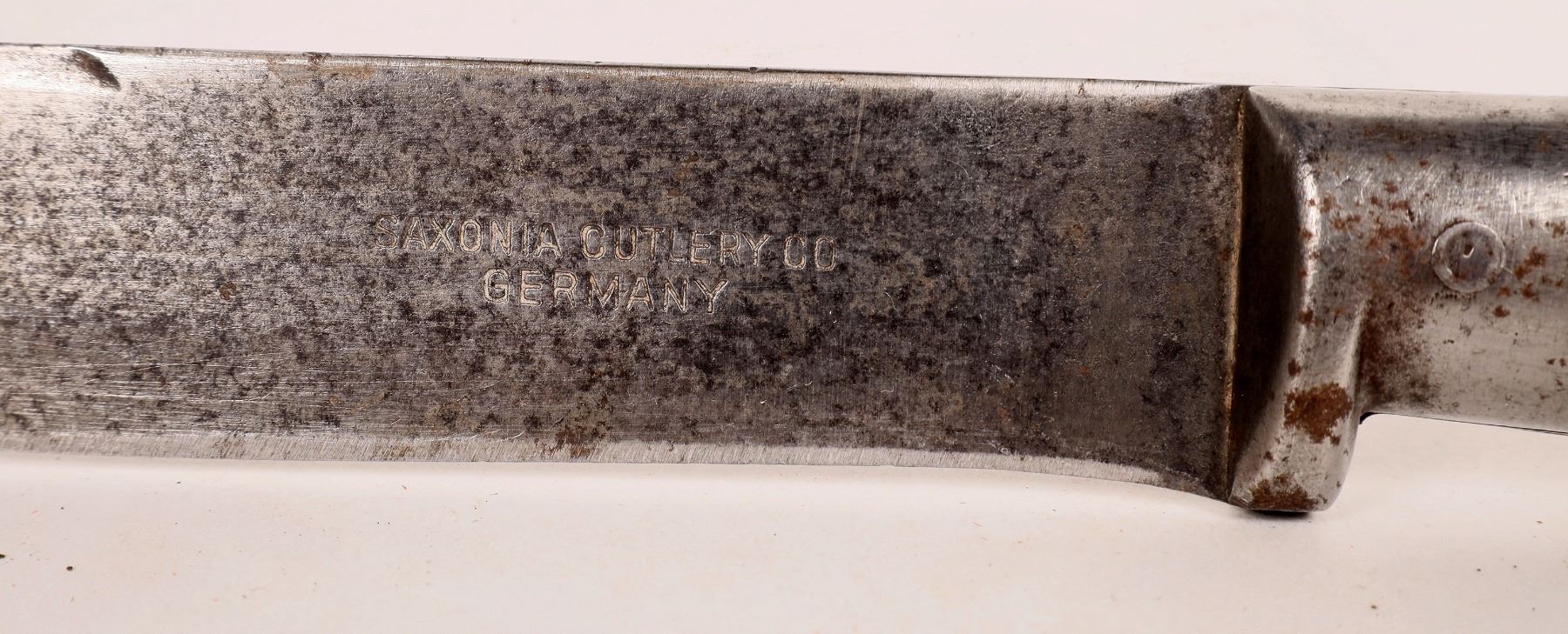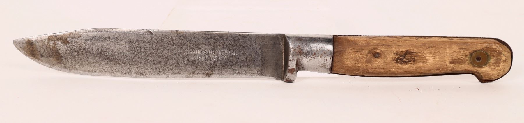 THis Bowie knife was made in Germany, at 10.5 in. 5.75 in. clip point blade. It has a false edge, a two piece ferrell made by Saxonia Cutlery Co. / Germany. Hardwood scales, bird's head butt with two rivet fasteners. Please see photos for details. Germany