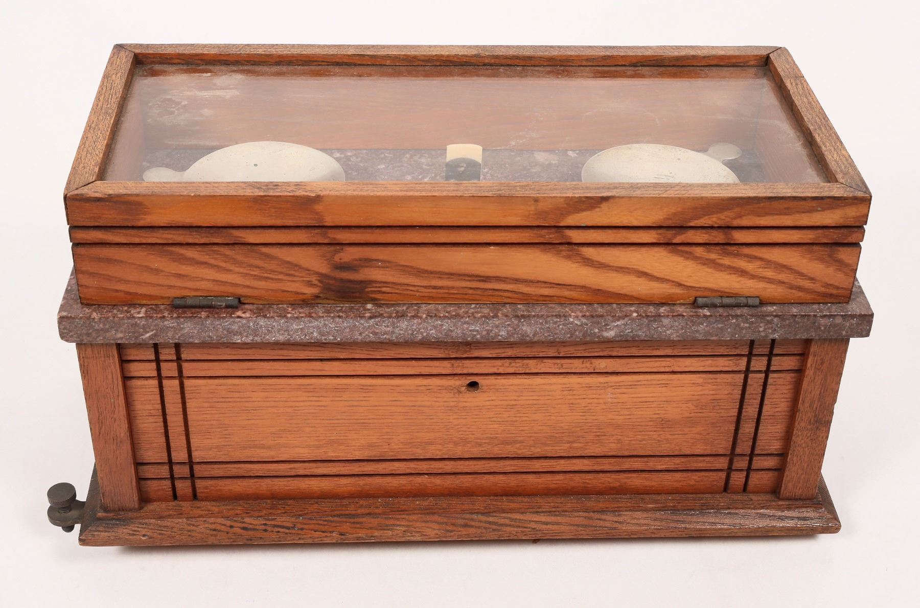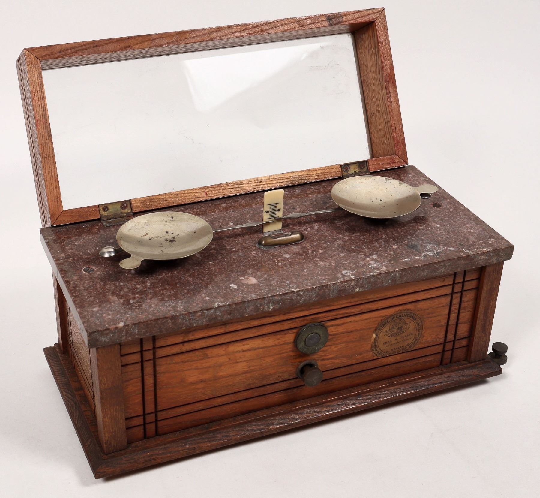 This portable scale was made by Henry Troemner a model 190 prepared for 1/2 oz. It is beautifully detailed with a glass top cover and the scale rests on a red marble slab. The case is of oak and brass hardware. There is an approval seal from Pennsylvania, New York, and a separate seal from the state of California dated 1927 by Chac. Fuller. The scale is made to level however, one corner foot is missing. Very good condition. 15 in. X 7 in. X 7 in. Please see photos for details.