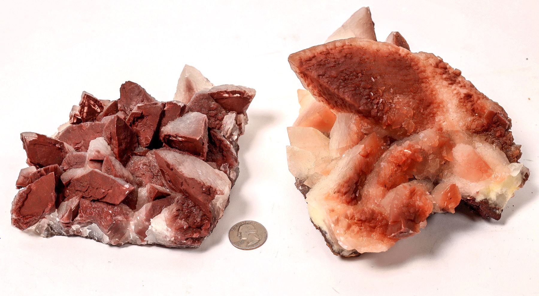 Two nice display specimens of cream-colored scalenohedral (a.k.a. dogtooth) calcite, the outer margins of which have been stained deep reddish brown by the presence of an iron mineral, probably hematite. Large, sharply pointed crystals, bigger than your thumb. The larger specimen has a sharp, single crystal more than five inches in length. 5.5 x 5.5 x 2.5 inches, and 7.5 x 6 x 4.5 inches. See photos for detail.