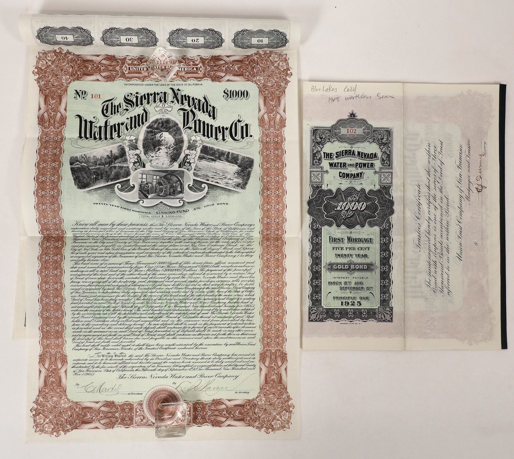 These are scam water bonds for The Sierra Nevada Water and Power Company (2). These are dated 1908 and the principle comes due in 1925. Interestingly, there are the same amount of $25 payment coupons removed from each bond.