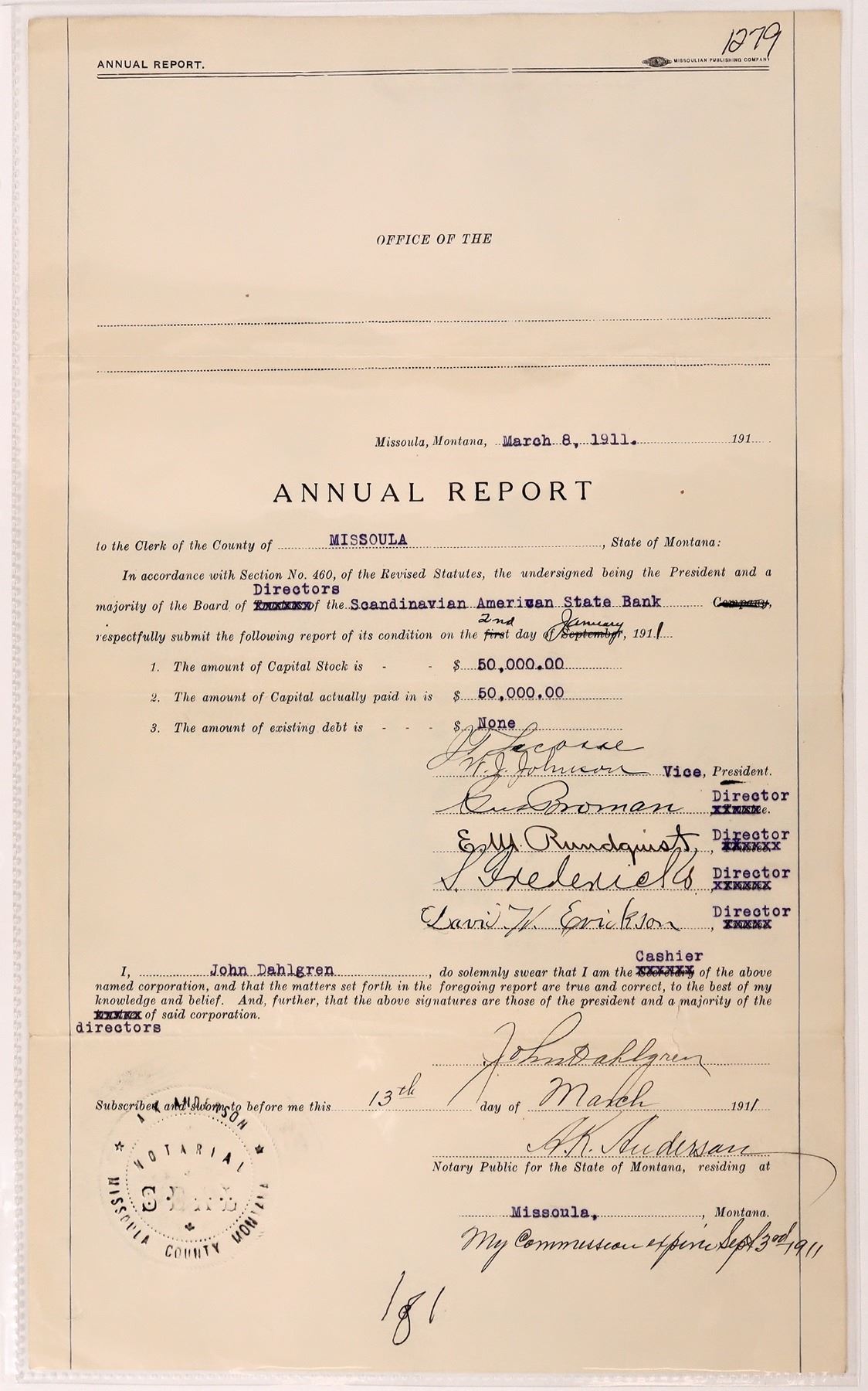 1911 Scandinavian American State Bank 1911 annual report. Signed by John Dahlgren as cashier, possibly the president too. Montana Missoula[ Missoula Montana
