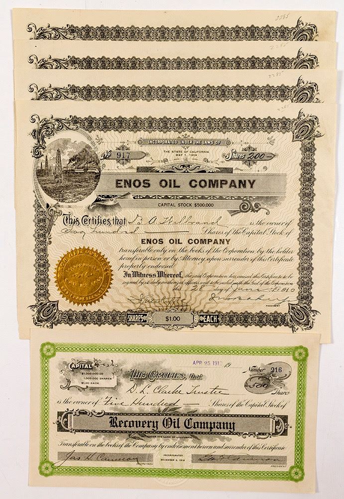 Lot of 5. 1-4) Enos Oil Company. Stock #900, 909, 917, and 927 in 1910. Signed by John Baker Jr. and L. Sutcliffe. 5) Recovery Oil from Kern County. Stock #216 for 500 shares to D. L. Clarke in 1912. Signed by James and George Cameron. These are indeed difficult to find stock certificates! Date: 1910 Location: California HWAC# 56910