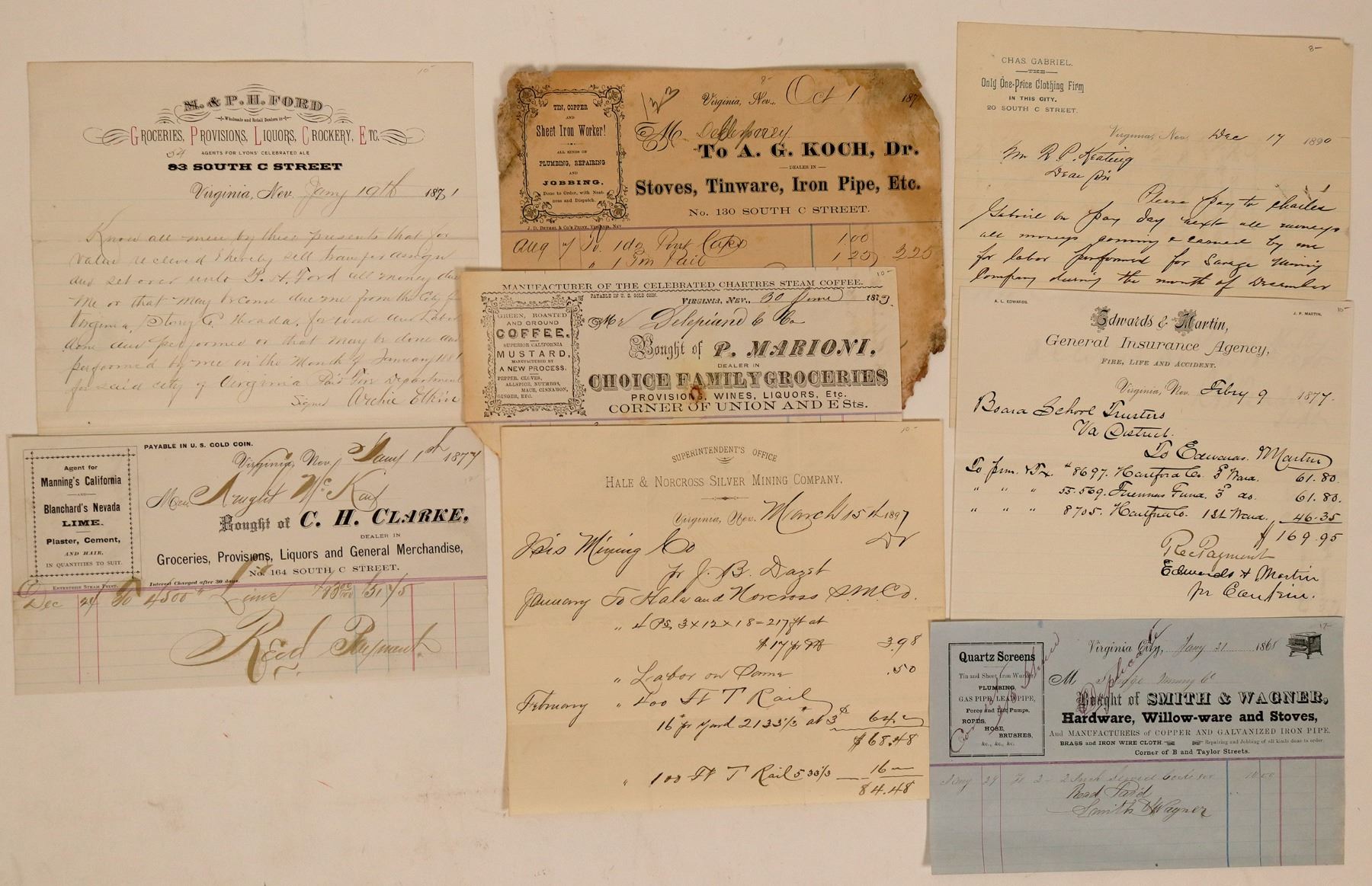 Lot of 8. Includes: Smith & Wagner Hardware (1868); M&PH Ford Groceries (1881); Edwards & Martin General Insurance Agency (1877); Chas. Gabriel Clothing (1890); Hale & Norcross SMC (1897); P. Marioni Groceries (1873, damaged); CH Clarke Groceries (1877); and AG Koch Stoves (1870s, poor condition).