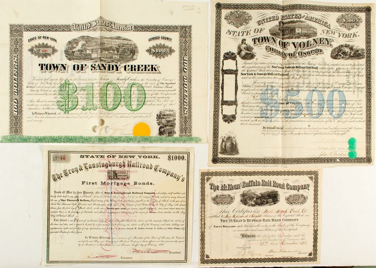 Lot of four. 1) $1,000 bond for The Troy & Lansingburgh Railroad Company. Issued 1868. Pen cancellations through signatures of the president and treasurer. Small vignette of horse-drawn rail car. Punch holes along top. 9" x 11.25" 2) Stock certificate for The McKean & Buffalo Rail Road Company. Issued for 208 shares in 1878. Pen cancelled. Vignette of locomotive on mountainside. 3) $100 Town of Sandy Creek bond issued for the Syracuse Northern Railroad Company. 1870. Punch cancelled. Yellow seal and two locomotive vignettes. 11" x 16.5" 4) $500 Town of Volney bond issued for the construction of the New York & Oswego Midland Railroad. 1868. Punch cancelled. Three vignettes: allegorical woman. locomotive, and cattle. 12.75" x 13.25" (Prag Collection) City: State: New York Date: 1868-1878 hwac# 33940