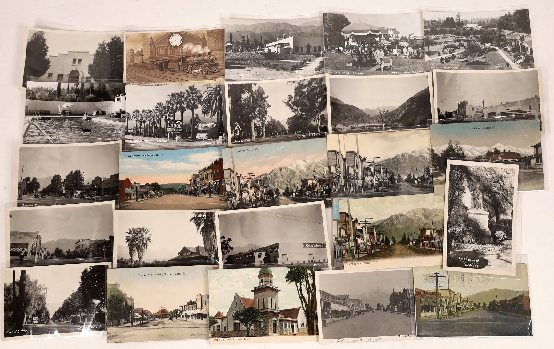 Collection of 26 postcards highlighting the agricultural SoCal town of Upland. Some of these are reproductions from an earlier time. Scenes shown include the Sunkist Packing Plant, Main Street , Bulah College and other building sea street scenes. Some have been used, some are blank. Please see photos for more detail and condition.